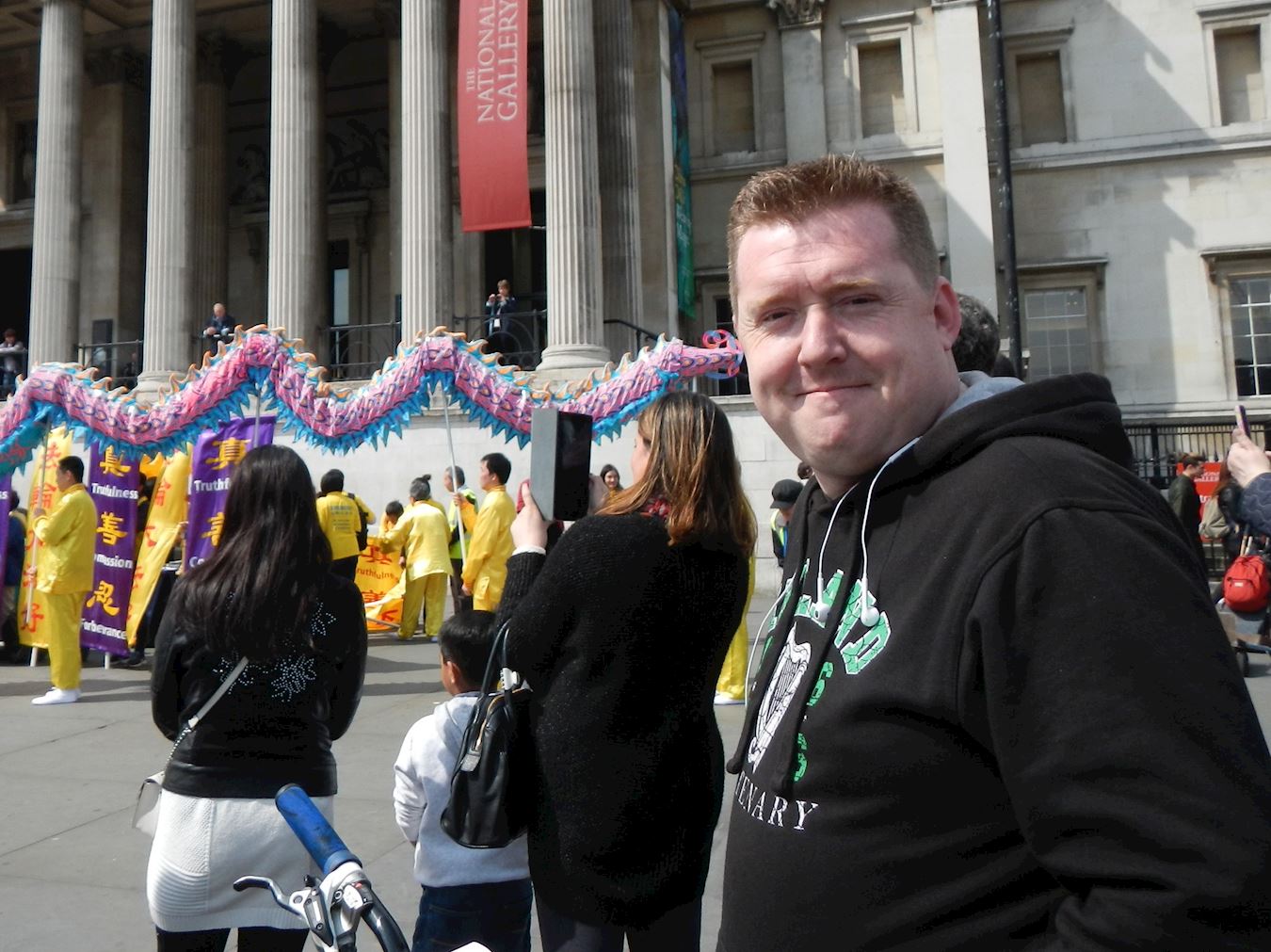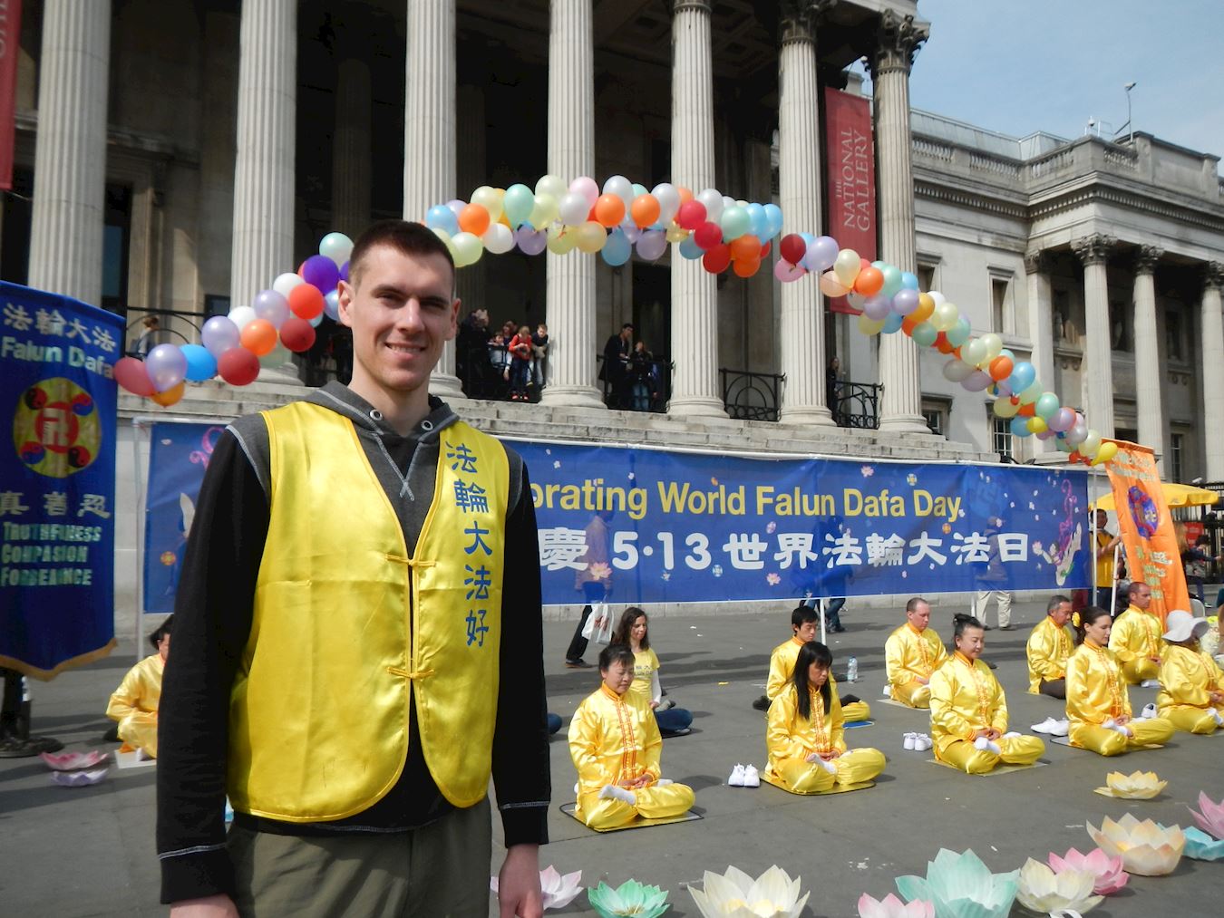 西人学员思戴夫诺斯·玛璀库喀斯(Stefanos Matrakoukas)是希腊人,在希腊服完兵役后,就来到英国学习,然后工作。他第一次听说法轮功是三年半前,利兹的法轮功学员在那里举行讲真相征签活动。那天,他读了真相传单,在请愿书上签了名,然后回家,在电脑前搜寻法轮功的讯息。一开始他是被法轮功祛病健身的奇效所吸引,参加了当地的免费教功班学功法。思戴夫诺说:“渐渐的,随着学习《转法轮》,我对法轮功的理解不一样了,我开始意识到能炼法轮功是一件多么奇妙的事。我炼法轮功后的最大改变是性格改变了。我改变了对待他人的方式,能以更宽容、更慈悲的方式对待别人。”