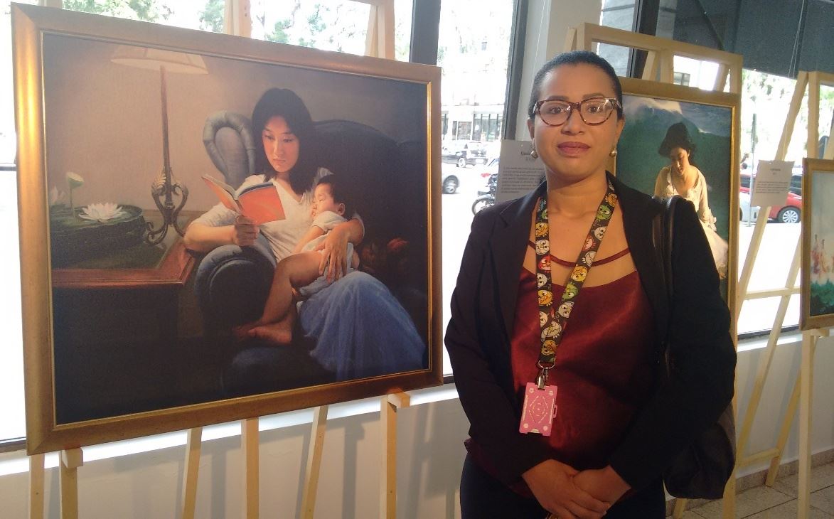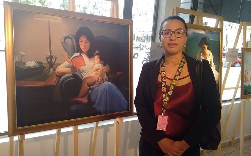 一个文静的姑娘Samara认真的看完了所有的画作,并坐下观看关于法轮大法的电视片,之后她询问在那儿可以请到《转法轮》,她要修炼法轮大法。