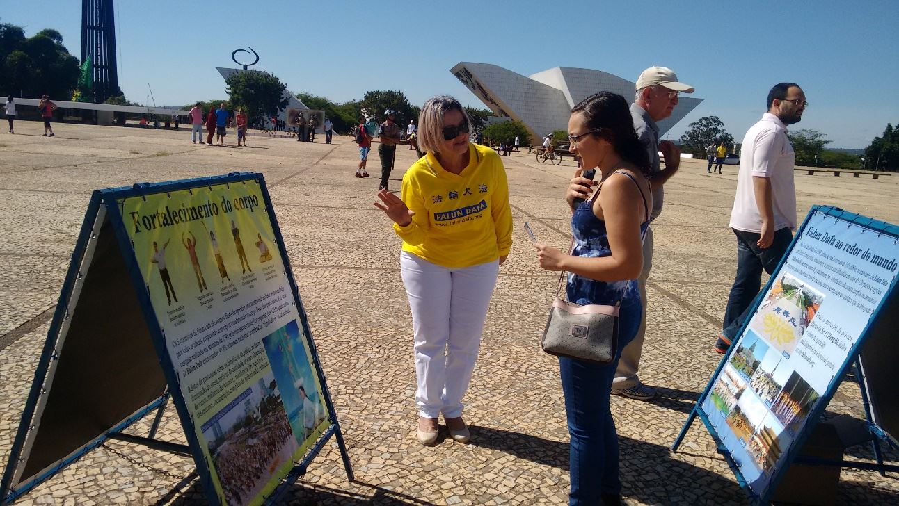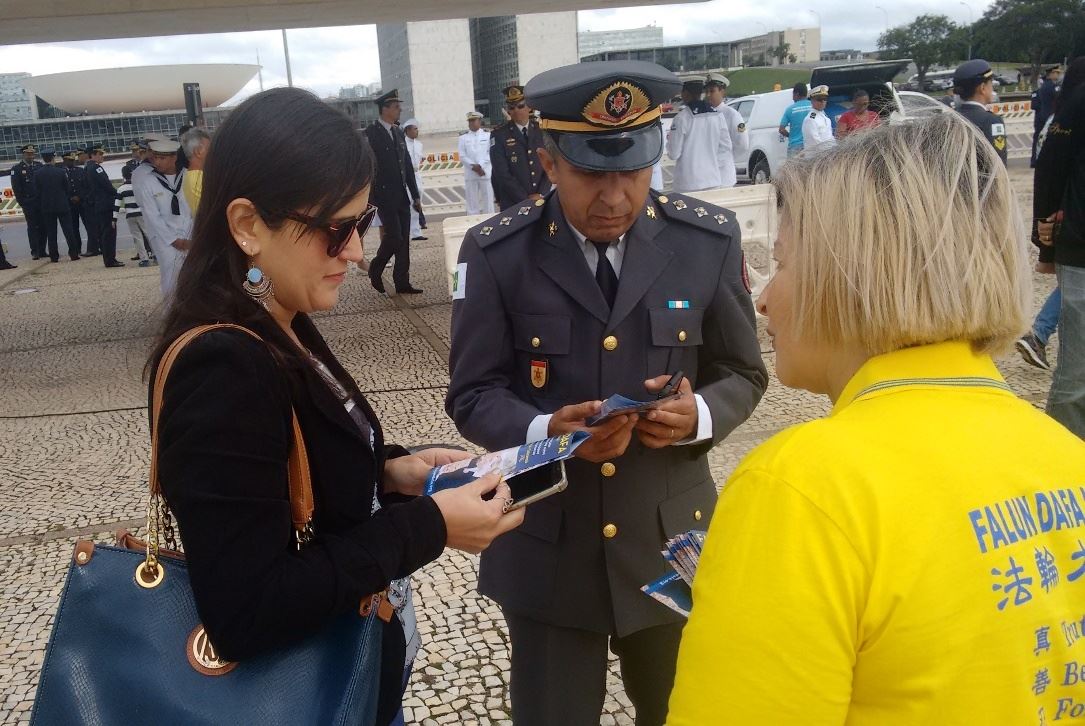 五月七日学员来到巴西政治中心——三权广场,这里每月一次举行换国旗活动,各军种军人和市民及各国大使交替前来观礼。学员摆上真相展板,手举“法轮大法好”、“停止迫害法轮功”的长横幅,与有缘人结缘。众多军人、市人、官员得到了真相传单,不少人观看了展板并听学员详细讲解,州长得到学员赠送的《·九·评*共产党》。