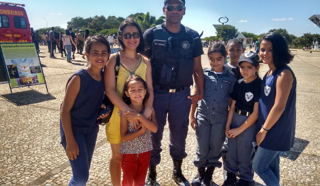 几十位从邻州驱车一小时赶来观礼的军校(Guarda Mirim Serafim)师生及家长,很喜欢听学员讲解,与学员合影,并大声的用中文跟学员学念“法轮大法好!真善忍好!”