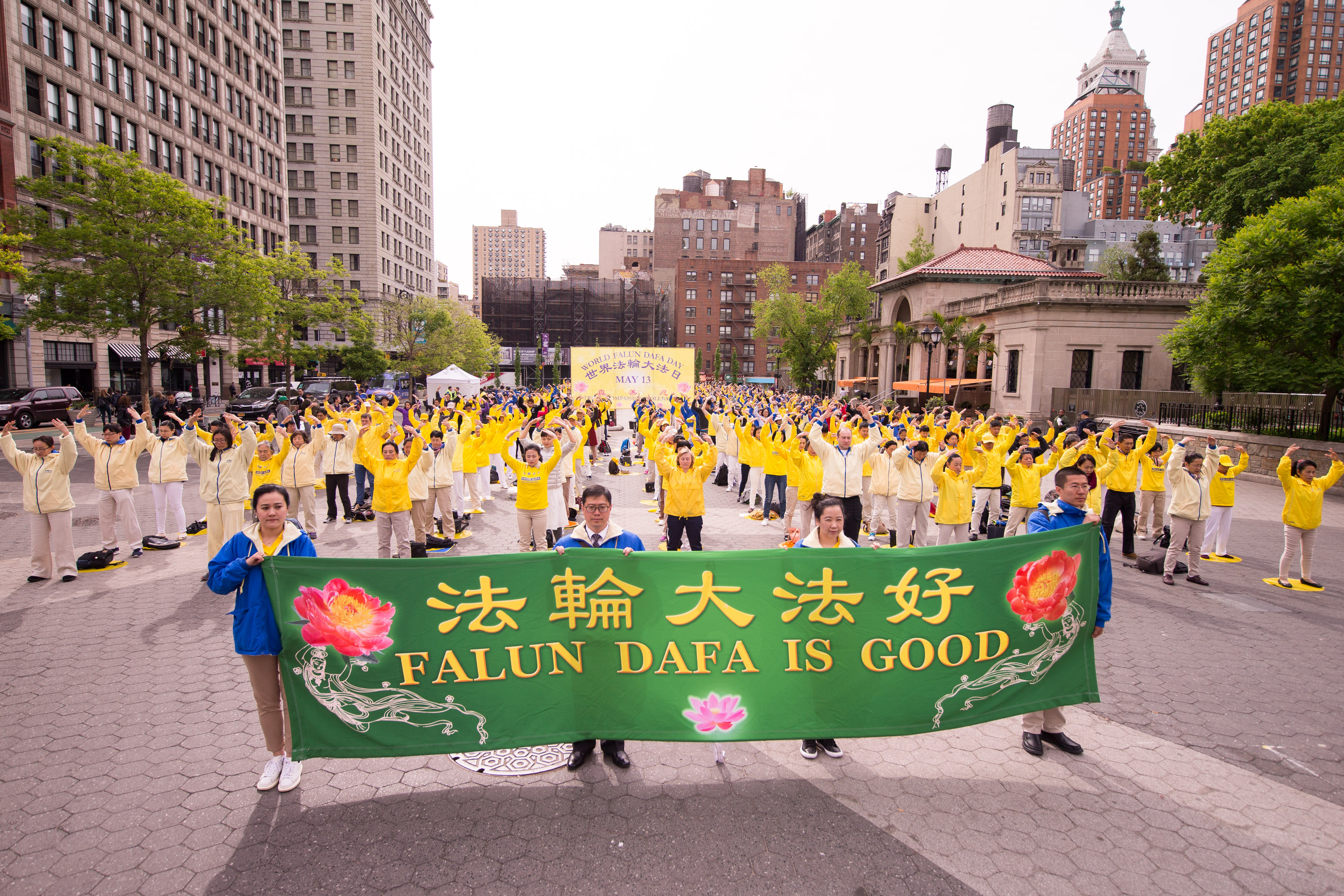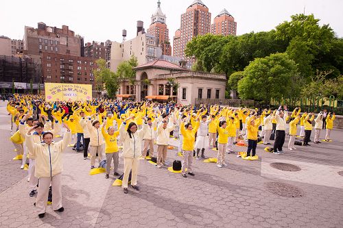 ![]() 图1-4:二零一七年五月十一日上午, 近千名法轮功学员在热闹的市中心祥和的炼着法轮功五套功法,拉开了纽约一连四天的庆祝“世界法轮大法日”活动。 |