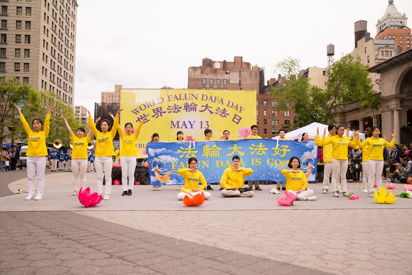 【明慧网二零一七年五月十二日】(明慧记者采菊纽约综合报导)二零一七年五月十一日中午,纽约曼哈顿中心的“联合广场”上彩带飘扬,彩旗飞舞,继上午的千人大炼功之后,法轮功学员继续欢歌载舞,以舞龙舞狮,唱歌,舞蹈,乐器演奏,功法演示等多姿多彩的方式,庆祝“第十八届世界法轮大法日”,祝贺“大法弘传世间二十五周年”,并恭祝慈悲伟大的师尊六十六华诞快乐。