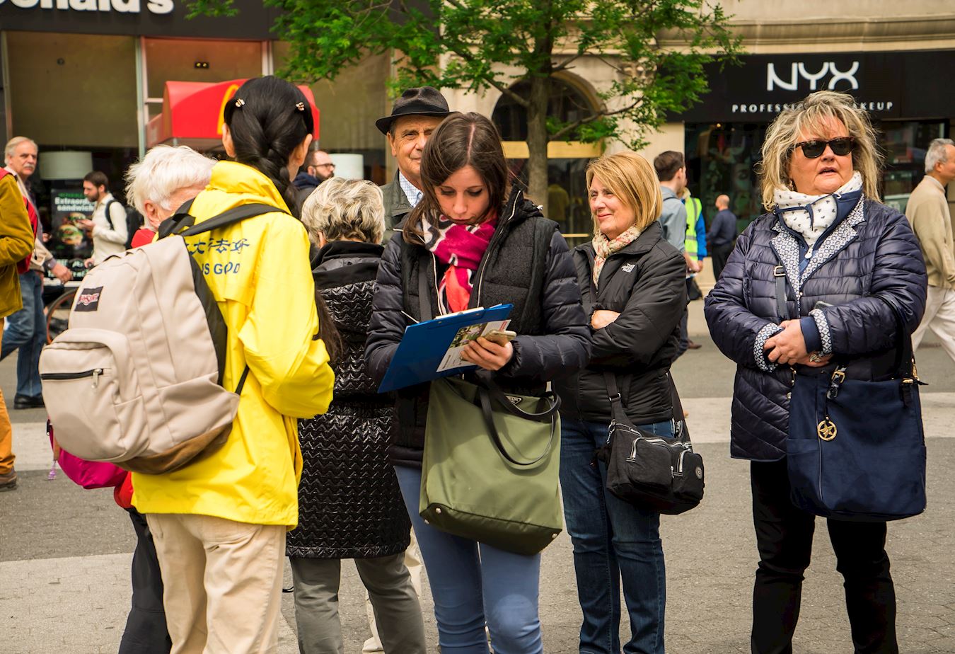 图7:法轮功学员的庆祝活动吸引过往路人驻足观看了解真相。