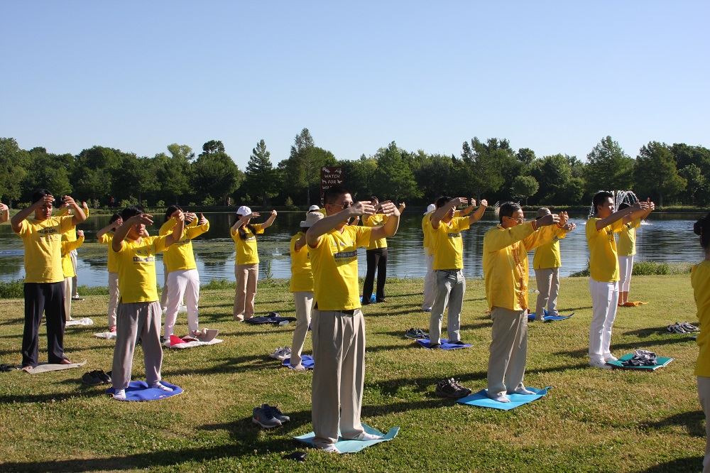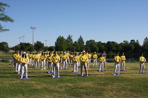 蓝天碧水,微风拂面,伴着优美的音乐,法轮功学员们在草坪上集体炼功的场景吸引过往人们。