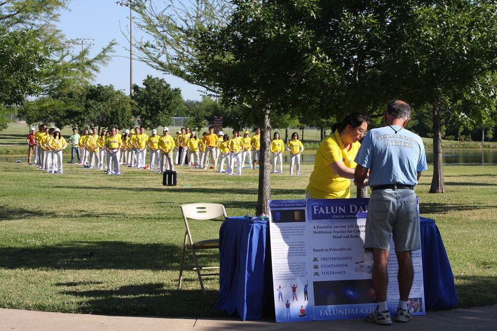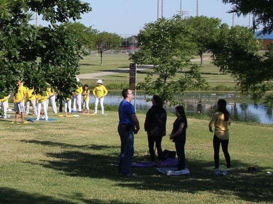 图4:达拉斯法轮功学员集体炼功,引人驻足,了解真相。