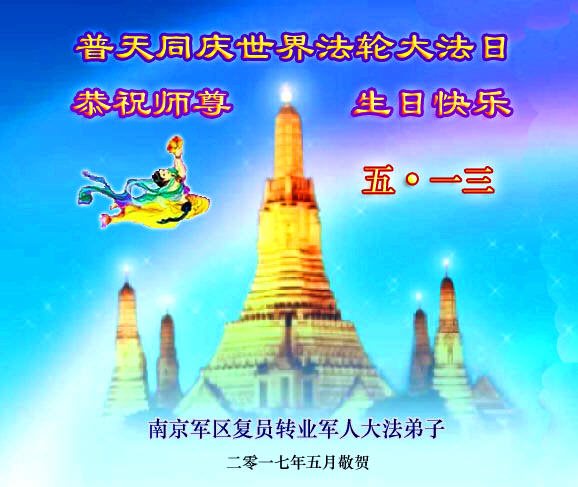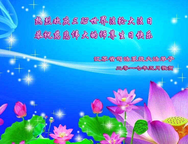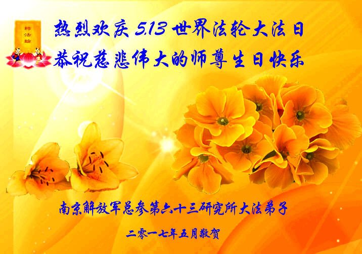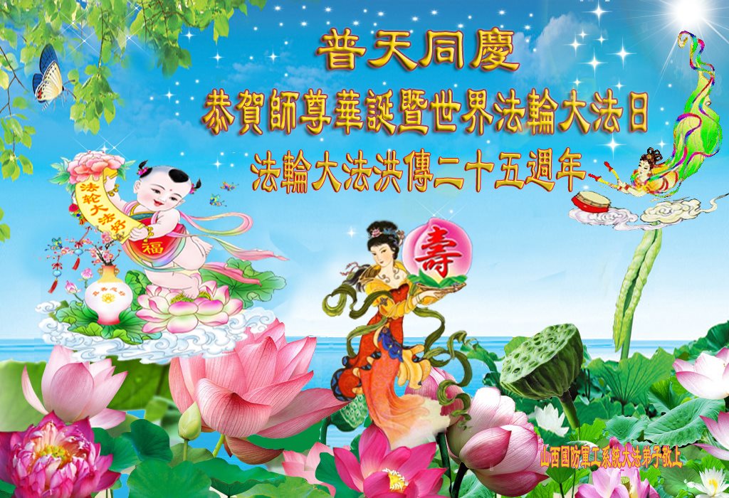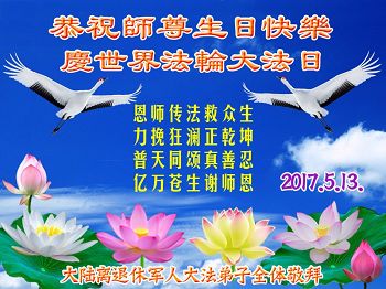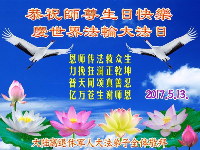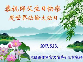 大法传世二十五周年,经过中共十八年残酷迫害、诽谤诬陷,大法弟子坚信大法、矢志不渝。在五月十三日师尊六十六华诞、世界法轮大法日、普天同庆的美好日子里,来自中国大陆政府机关、公检法司和军队的大法弟子给慈悲伟大的李洪志师父发来贺信,感谢师尊救度之恩!