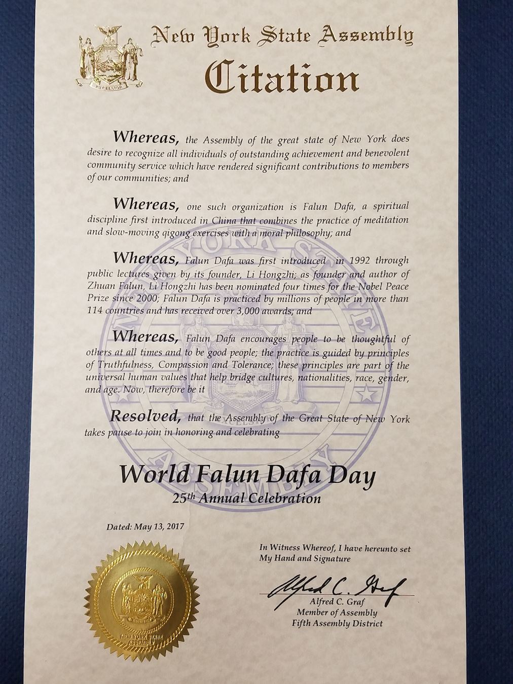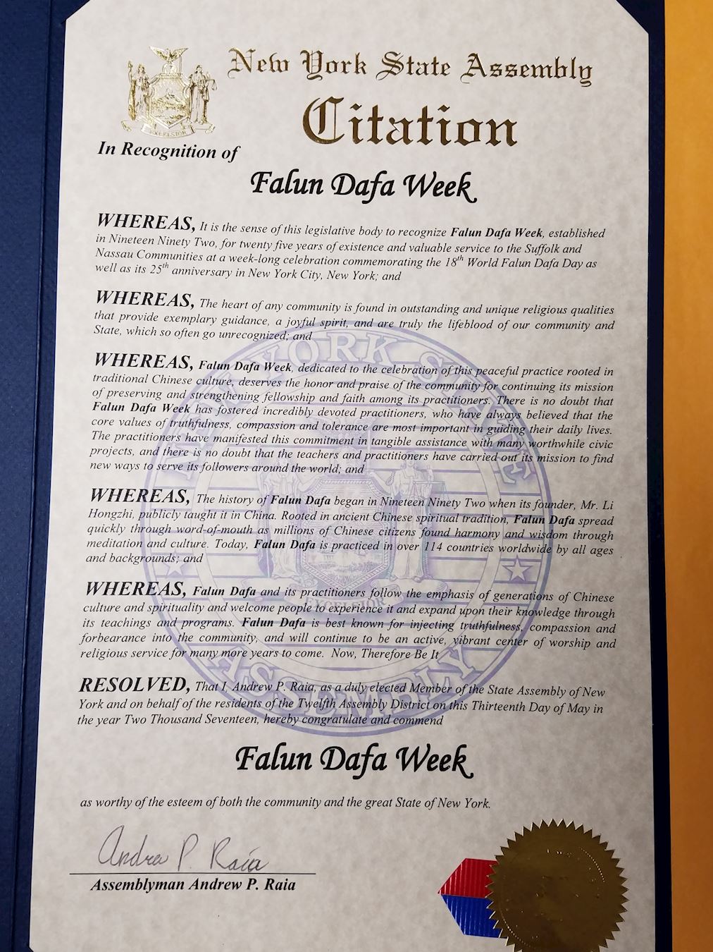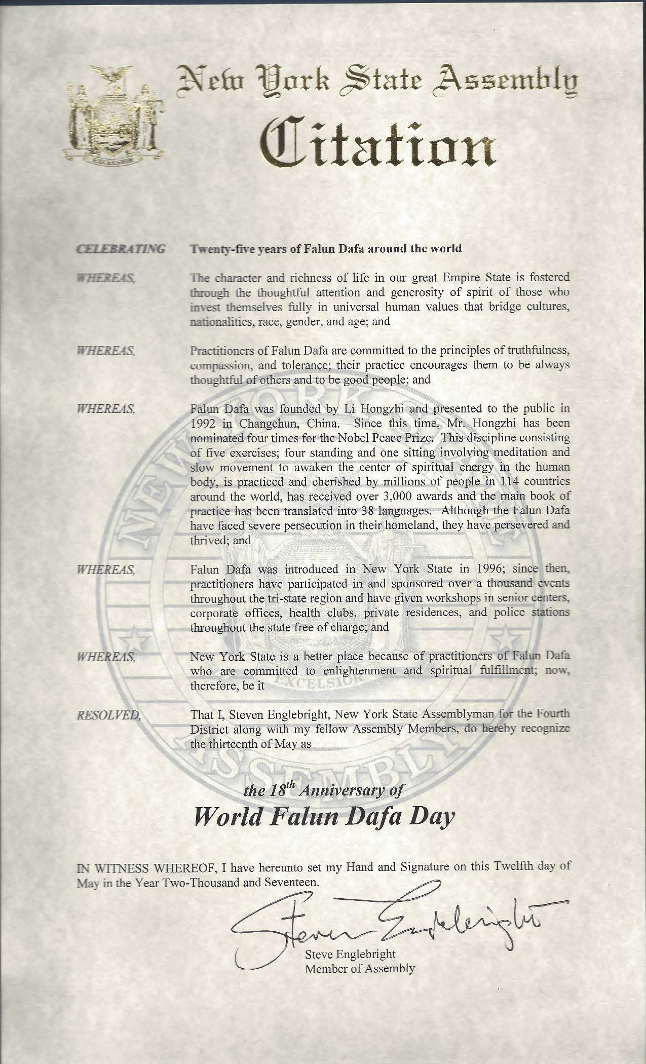 法轮功发言人张而平先生向民众介绍了大法的美好,并展示了纽约一百多位各级政府官员祝贺“第十八届世界法轮大法日”并“大法弘传世间二十五周年”发来的褒奖贺信。接着,数位学员演示了简单易学的法轮功五套功法,美丽的大法横幅映衬下,学员们祥和的功法演示,水红金黄,一幅绝美的画面。