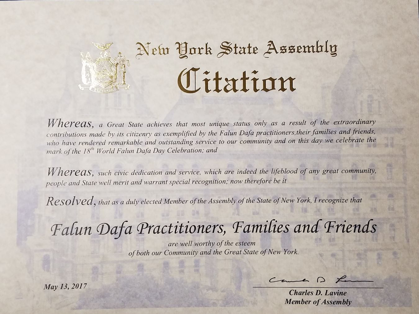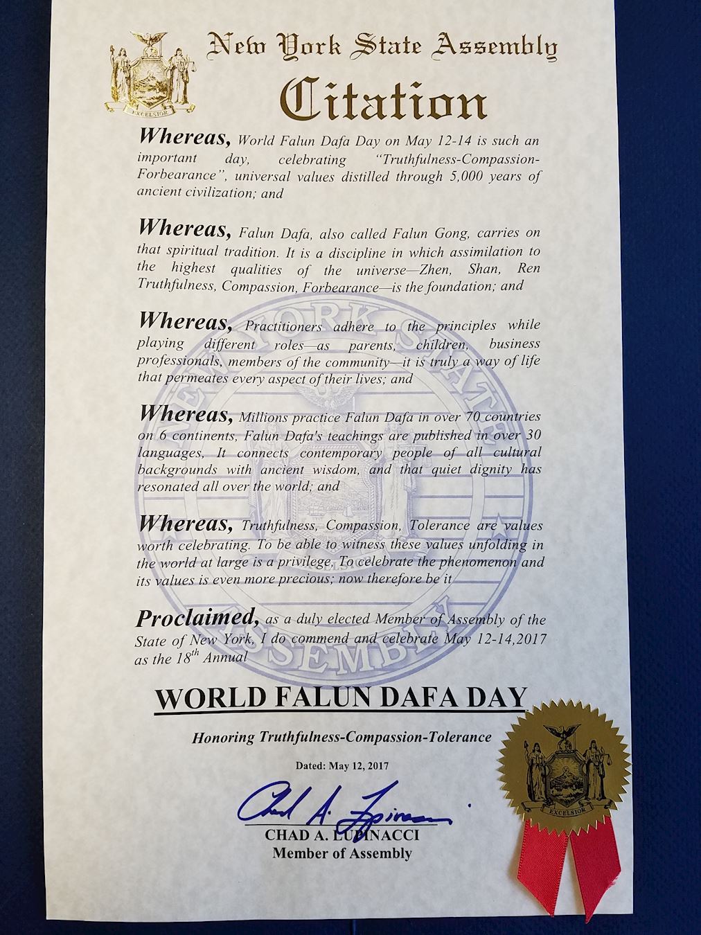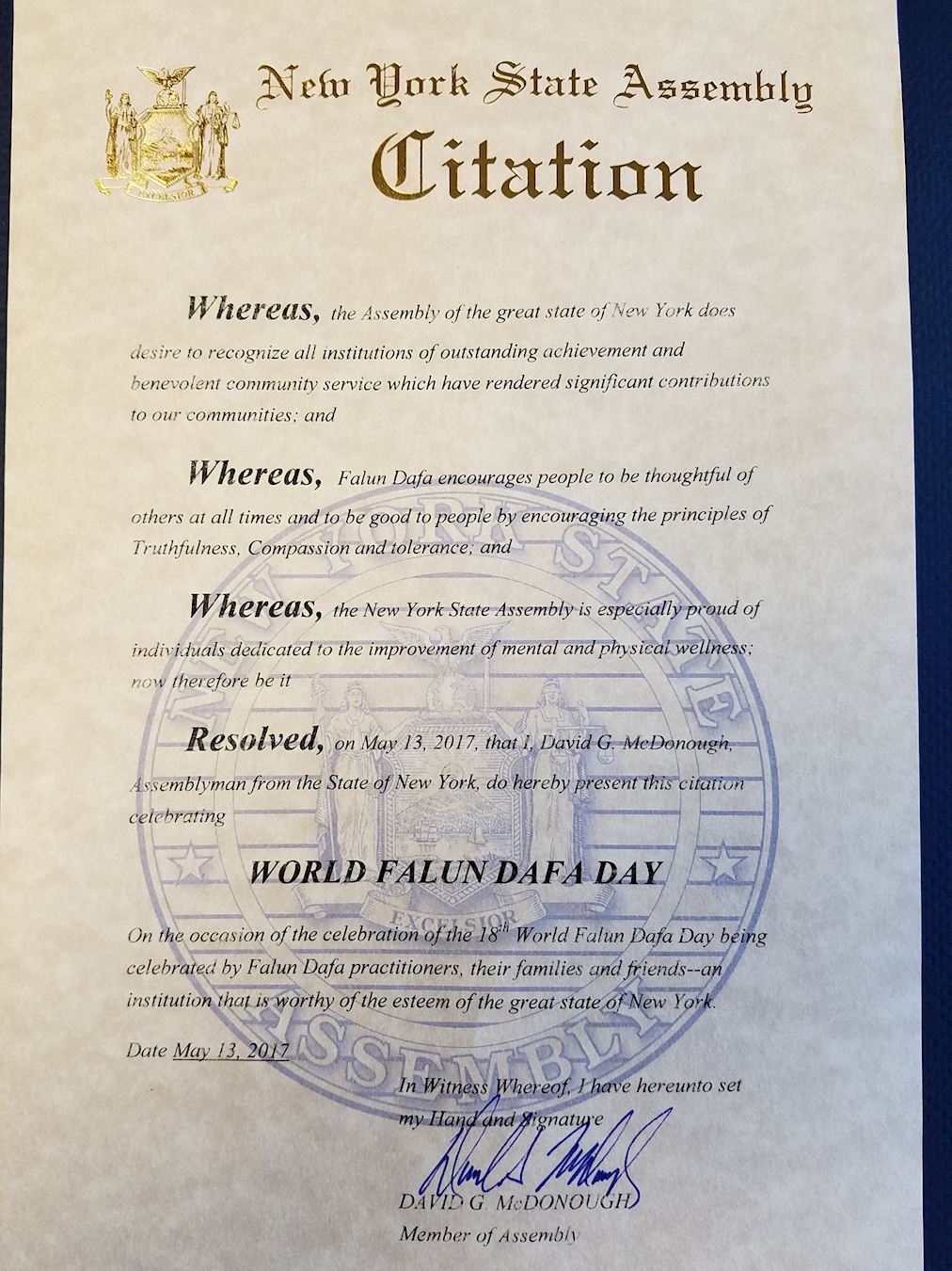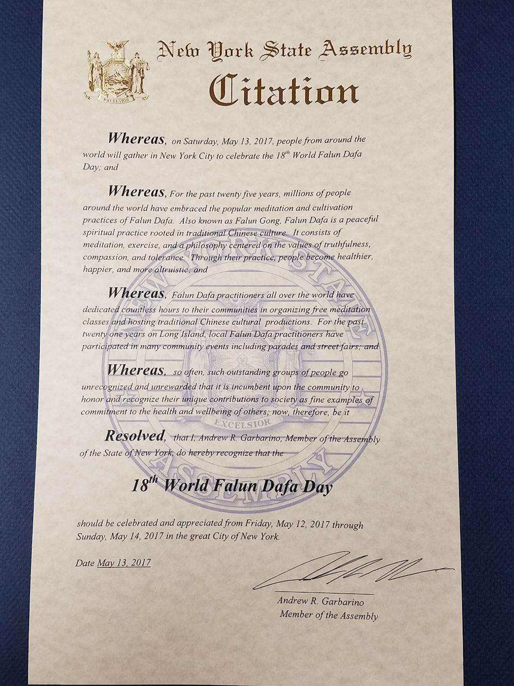 法轮功发言人张而平先生向民众介绍了大法的美好,并展示了纽约一百多位各级政府官员祝贺“第十八届世界法轮大法日”并“大法弘传世间二十五周年”发来的褒奖贺信。接着,数位学员演示了简单易学的法轮功五套功法,美丽的大法横幅映衬下,学员们祥和的功法演示,水红金黄,一幅绝美的画面。
