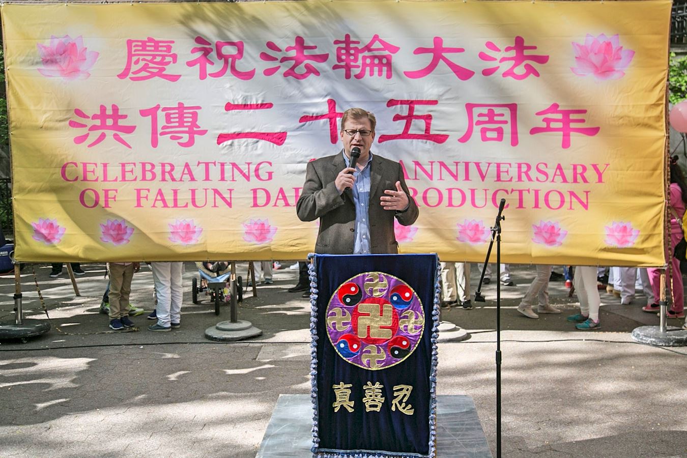 法轮大法信息中心主任李维·布莱迪(Levi Browde)首先在集会上发言,他说:“千万年来,人类一直在探索宇宙的奥秘和寻找人类生存的意义,法轮功再现了古老而深邃的信念,即生命的真正意义是从启智慧,返本归真。”