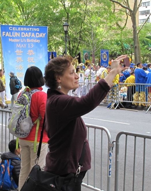 一位居住在加拿大的年轻中国女士来纽约旅游,巧遇法轮功学员举办的活动,她在活动现场驻足观看许久。她表示了解法轮功,因为她在国内的家人中就有人炼。她说要把今天活动的照片传给家人看。她介绍自己支持家人炼法轮功,也早已作了三:退.。