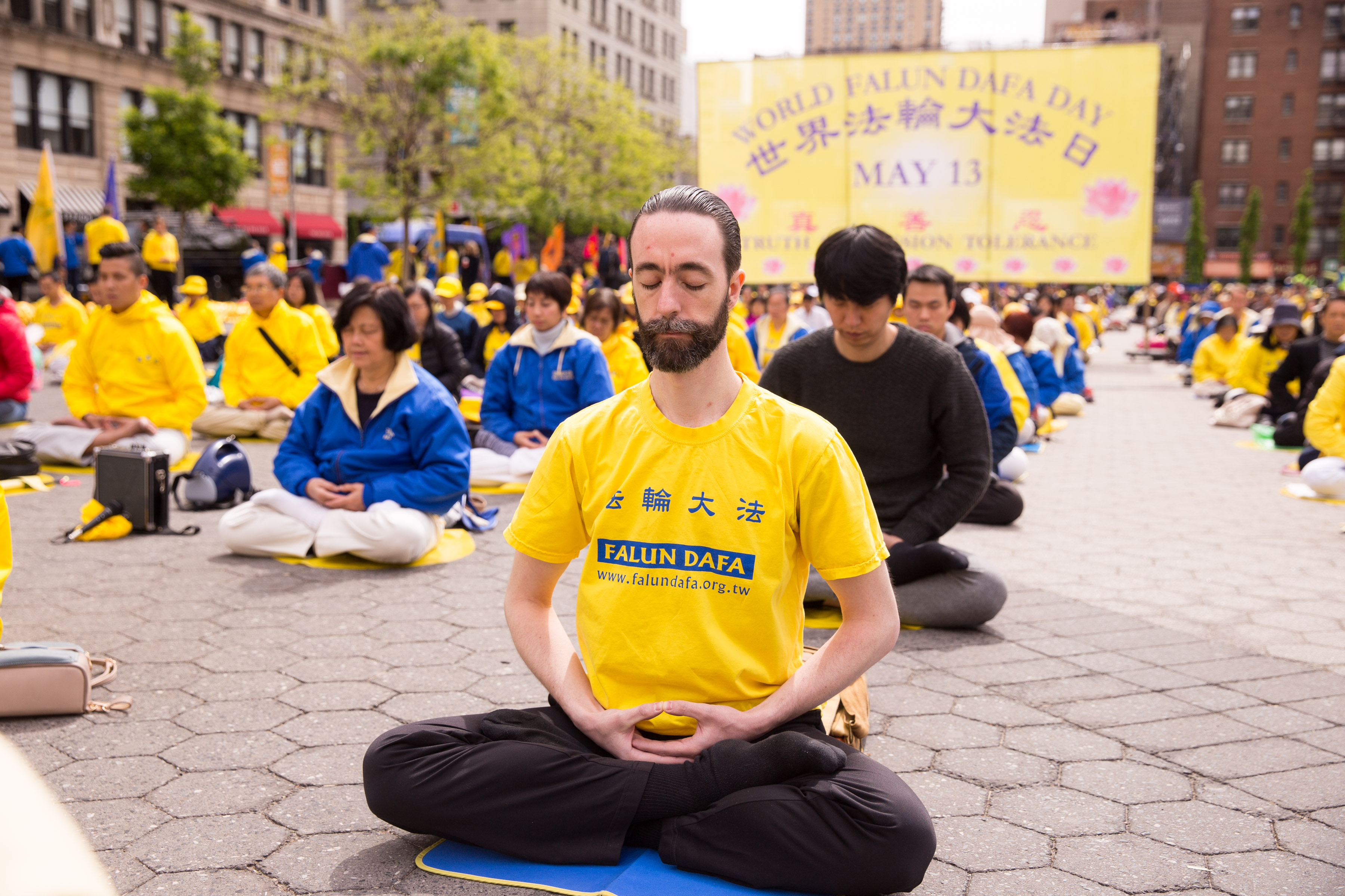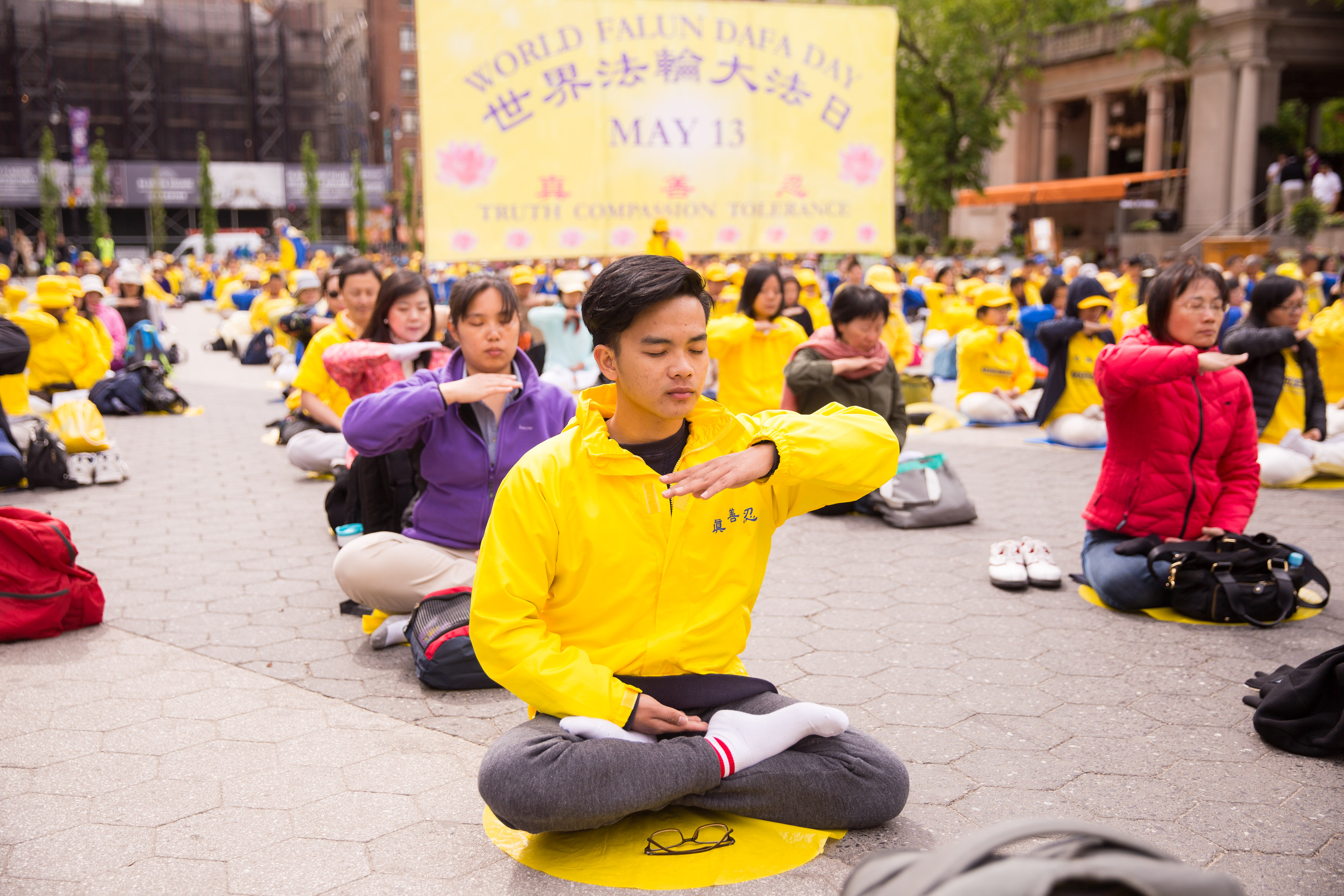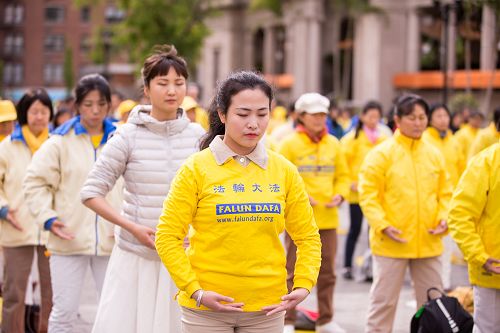 ![]() 图1-4:五月十一日清晨,各族裔法轮功学员在曼哈顿中城联合广场集体炼功,跟民众分享大法的美好。 |