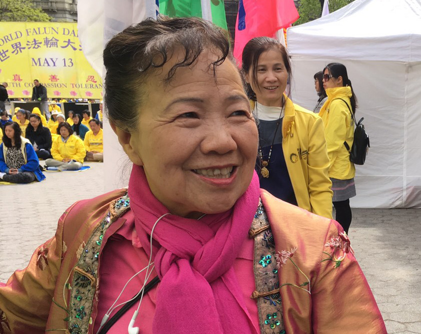 在两旁手拿彩旗的学员中,有一位笑容可掬,殷切的向来往路人派发传单的小个子女士叫茶妹,今年七十四了。她说,感谢法轮功创始人李洪志师父,因为修炼法轮功,让她的顽疾不治而愈。回顾当初,茶妹不禁哽咽。当年,茶妹患过一种奇怪的病,开始时十个指头出现黄豆大的肿块,感觉麻麻的,而且麻木的感觉会移动,轮番在身体各个部位,游走变化。从手到脚,随着时间的推移,发作的间隔越来越短,麻木的感觉区域也越来越大。而医生则说不清是什么病。茶妹到处去求医问药。不到两年就发展到全是麻痹和疼痛。她以为是中风的前兆。一个治疗师告诉她,你要想身体没有病就去炼法轮功。于是,媳妇陪同她一起去参加法轮功的九天讲法班。