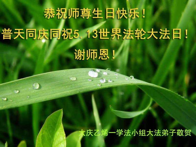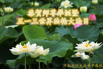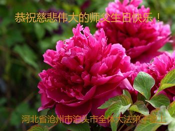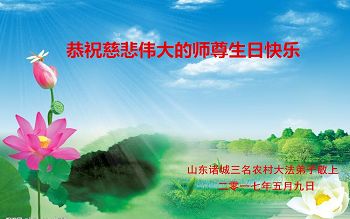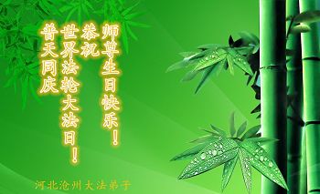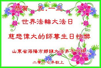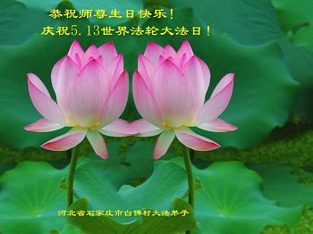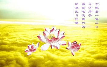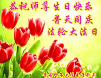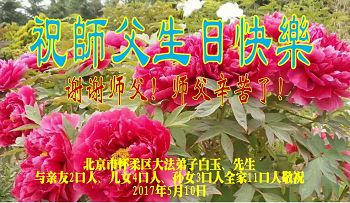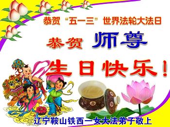 我很相信师父,我每天先漱漱口,默念或大声念:“法轮大法好,真、善、忍好”一天念几百遍,我已经念了几年了。去年,我出了车祸,师父保护了我的命。听大法弟子说:5月13日是师父的生日,我听后很激动,也不知道是几点几分,大法弟子说让我说一句问候话,把口信可以传给师父。我郑重地说:师父您好!我代表我全家向您问好!祝慈悲伟大的师父生日快乐!