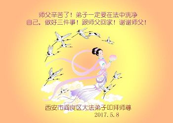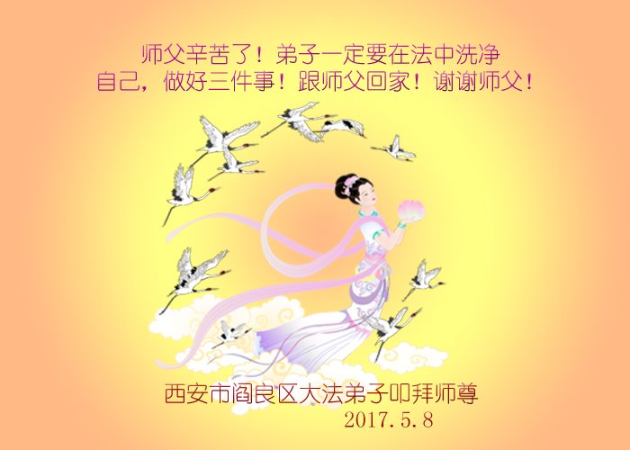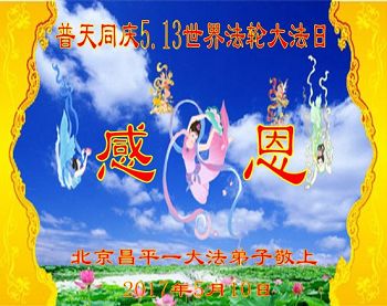 谢谢师父在这特殊的历史时期给了我人身,又与您和大法同在一世;是您安排大法弟子给我讲真相使我更加坚信“法轮大法好,真善忍好”这九字吉言;又是您力挽狂澜、拯救了宇宙、挽救了众生。师父谢谢您,我永远支持法轮大法和大法弟子所做的一切,法轮大法好,真善忍好以牢记心中。
