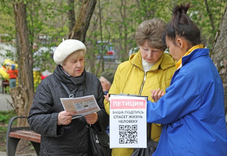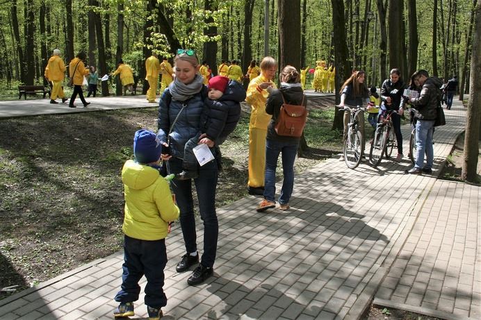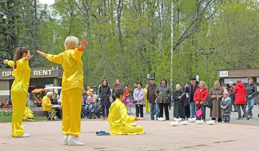 而后,在公园的舞台上主持人向在场的游客们详细介绍了法轮功,讲述了法轮大法给人类身心健康带来的益处和在世界上的洪传。然而在中共的独裁统治下不允许共产党以外的其它信仰留存,从1999年开始了对法轮功学员的残酷迫害,大量的法轮功学员被活摘器官致死牟利。