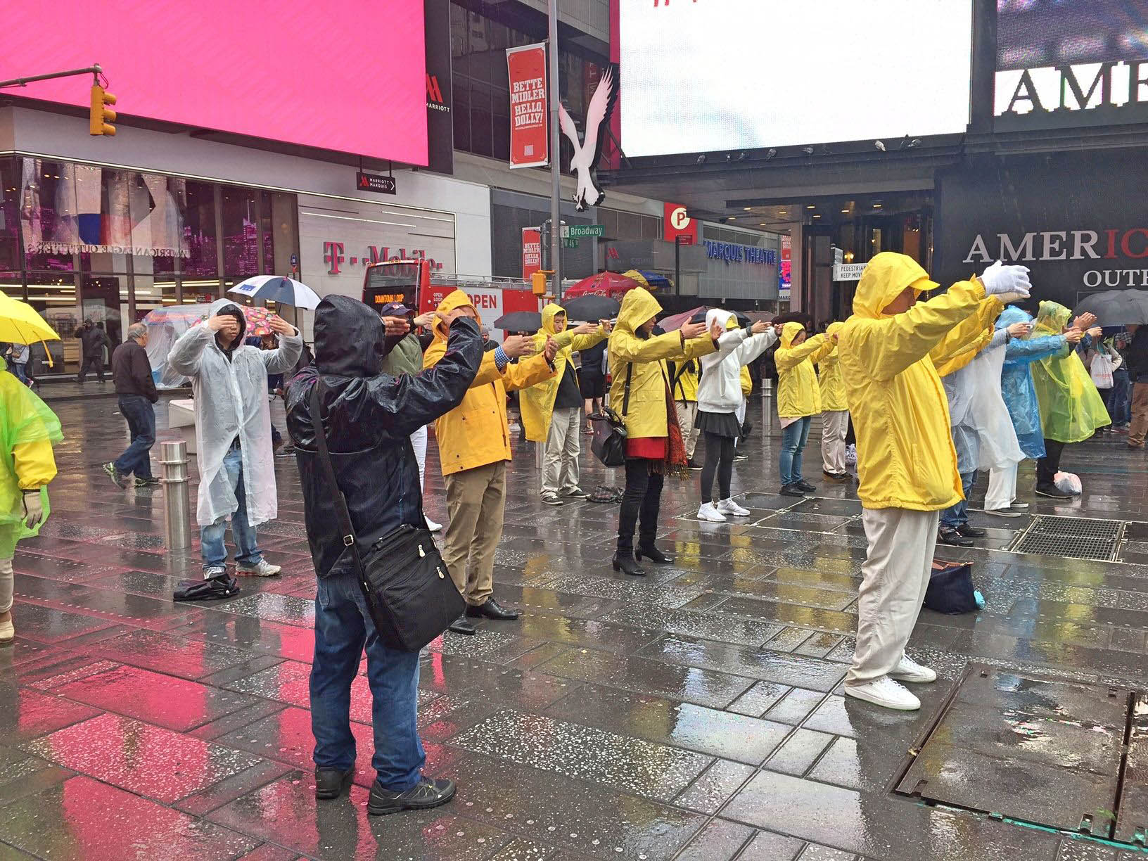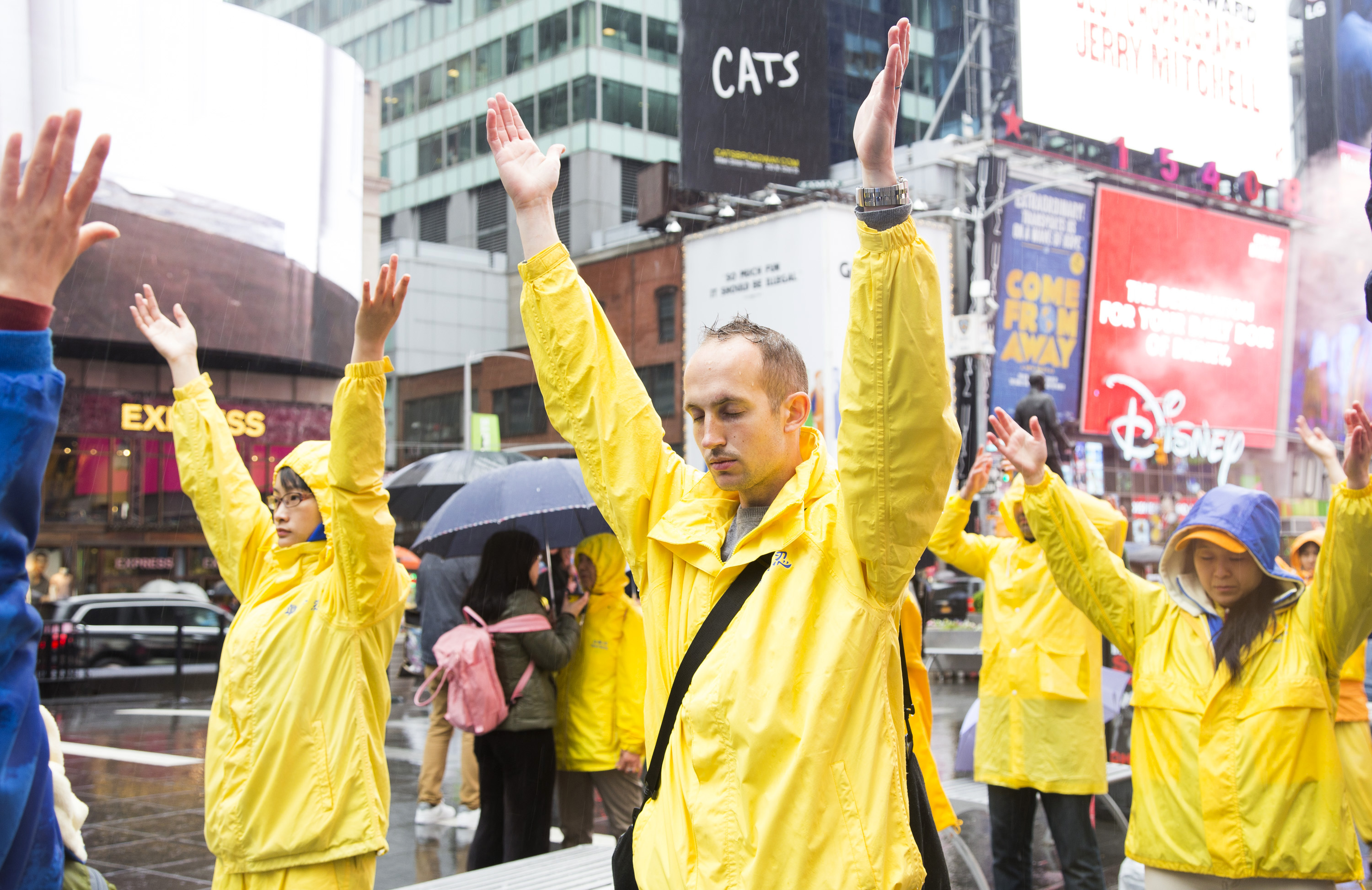 Michell说,当她第一眼看到这么多人打坐时,她的感觉是“多么平和”。Allen接着说:“这很不同寻常,人们总是把时代广场和一些光怪陆离的事情联系到一起,但是这些打坐的人是那么的平静祥和。”