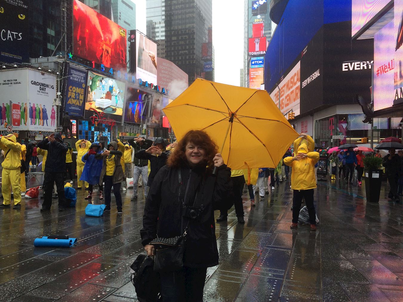 她说:“今天早上,能在时代广场看到人们在这里炼功,非常令人惊艳,尤其是还在雨中。都是黄颜色,它代表和平与光明。黄色安抚心灵。”