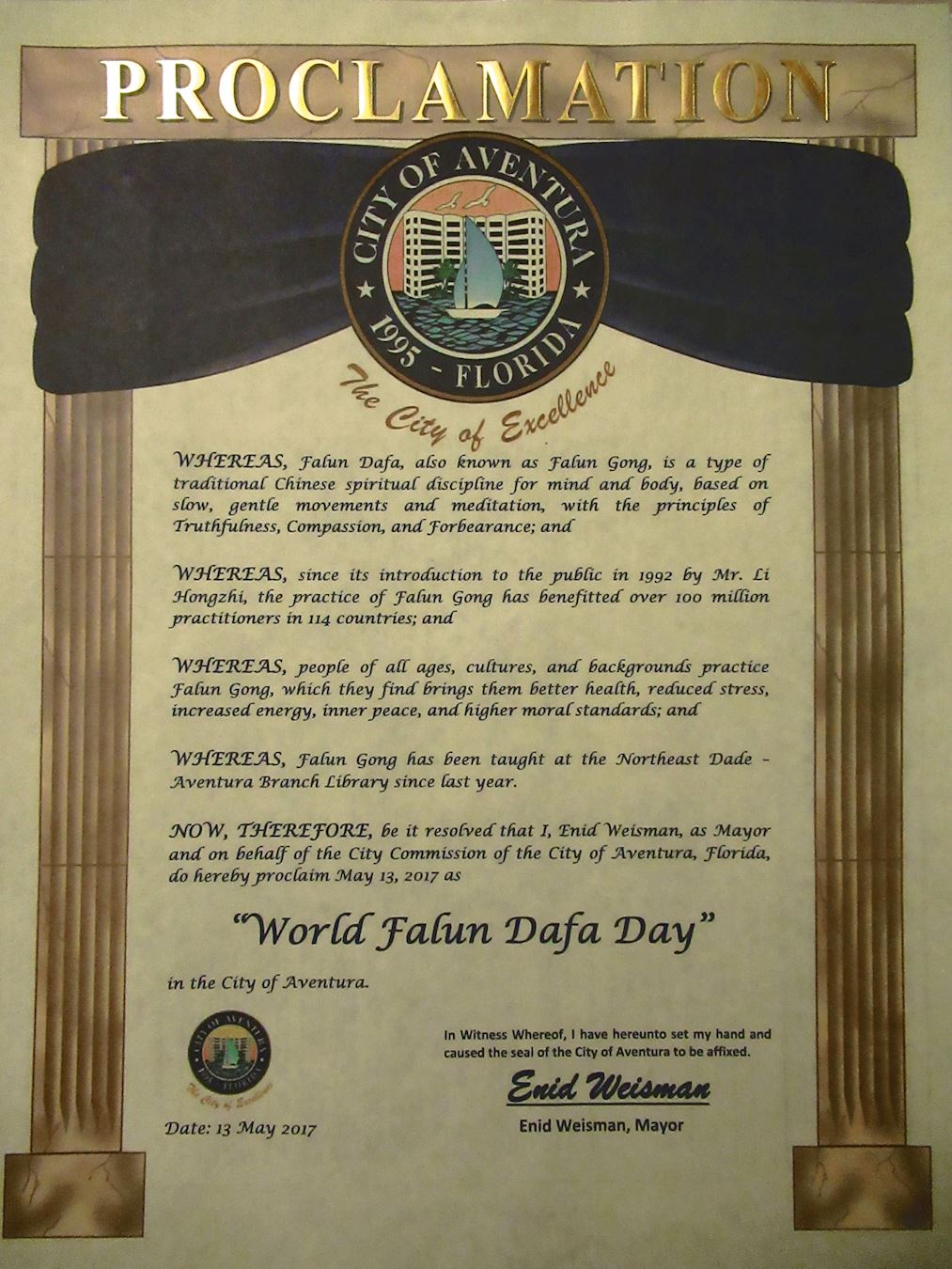 【明慧网二零一七年五月十八日】二零一七年五月十三日是法轮大法弘传世界的第25周年,继美国佛罗里达州圣彼得堡市市长发布褒奖状后,佛州阿文图拉市(Aventura)市长伊尼德·韦斯曼(Enid Weisman)颁发褒奖状,颂扬法轮大法为人们带来身心健康和更高的道德标准,并宣布二零一七年五月十三日为阿文图拉市“世界法轮大法日”。