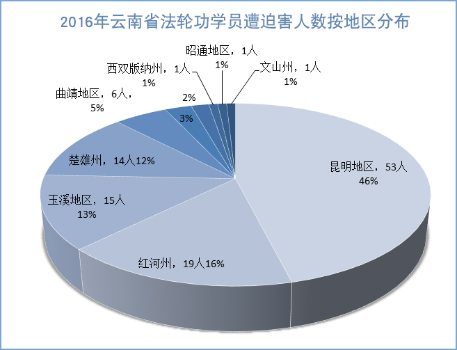 从以下地区分布图上可以看出:迫害人数最多的是昆明地区53人,占总数的46%;其次是红河州19人,占总数的16%;玉溪地区15人,占总数的13%;楚雄州14人,占总数的12%;曲靖地区6人,占总数的5%;大理州3人,占总数的3%;丽江地区2人,占总数的2%;昭通地区、文山州、西双版纳州各1人,分别占总数的1%。(见图2 :2016年云南省法轮功学员遭迫害人数按地区分布)