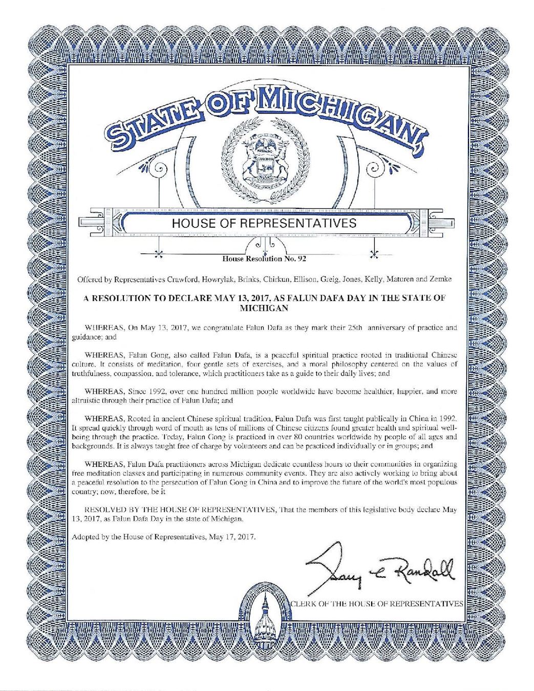 由众议院,及立法机关的成员决定:宣布二零一七年五月十三日为密西根州的“世界法轮大法日”