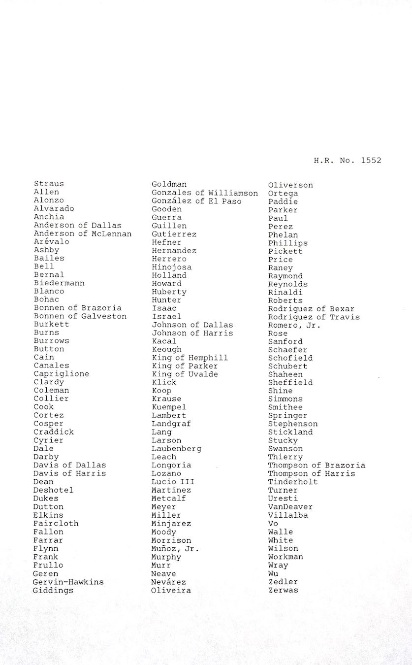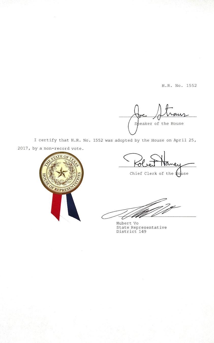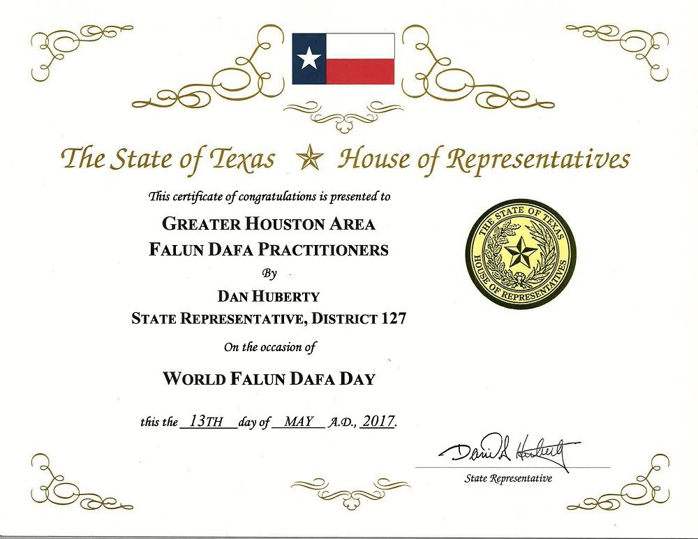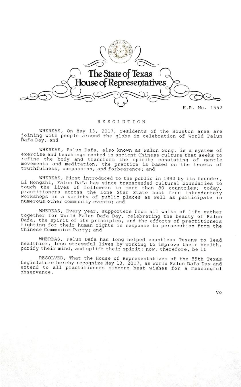 德克萨斯州通过了州众议员Hubert Vo起草,有众多议员支持的1552号决议案,决议案决定 “德克萨斯州第八十五届议会的议员宣布二零一七年五月十三日为世界法轮大法日,并向所有参加庆祝活动的修炼者致以美好的祝愿。”