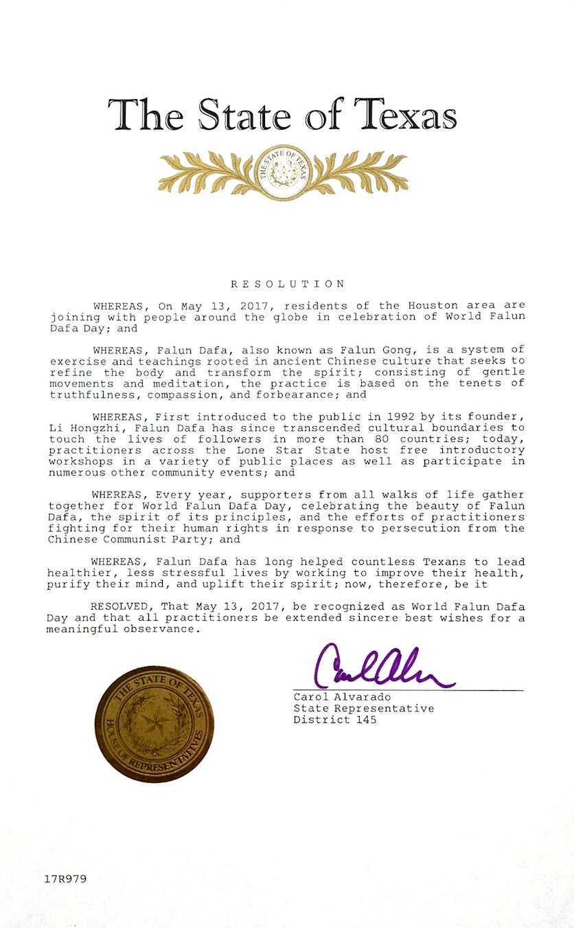 德克萨斯州州众议员Carol Alvarado颁发决议案,定五月十三日为“世界法轮大法日”。
