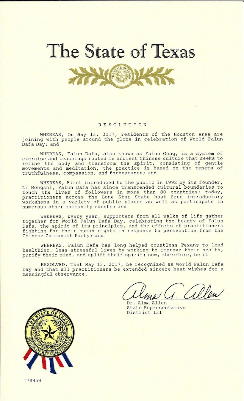 德克萨斯州州众议员Alma Allen颁发决议案,称赞法轮大法帮助很多德州人有拥了更健康身心的生活,宣布五月十三日为“世界法轮大法日”。
