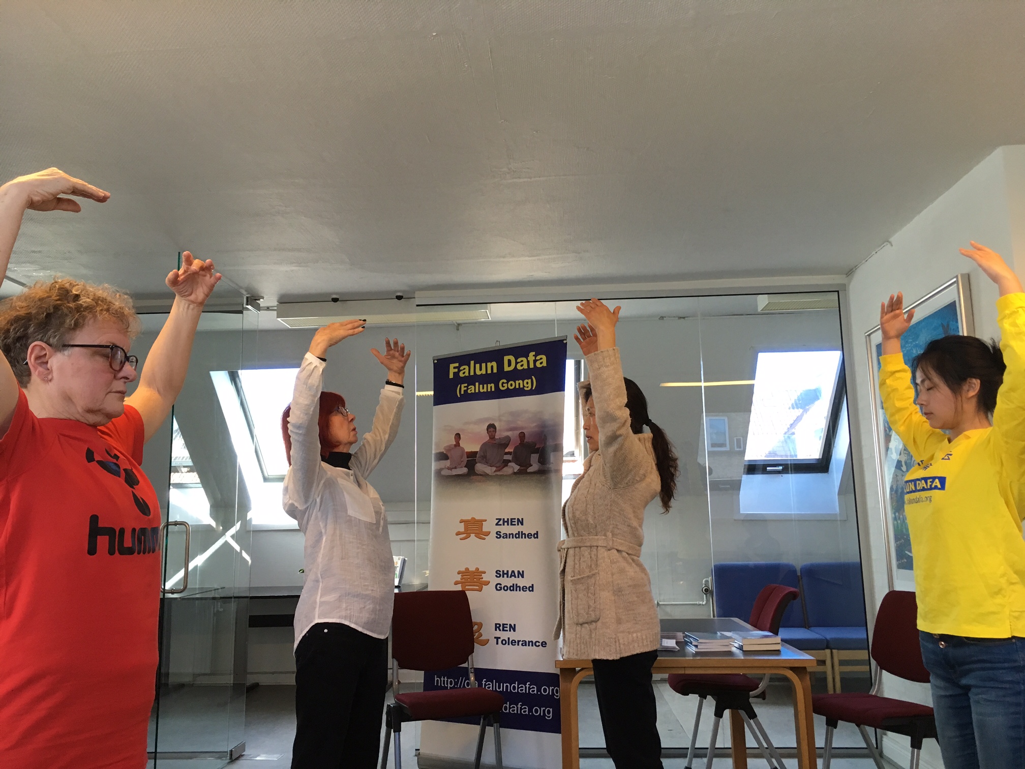 于是,二零一七年四月二十三日周日,法轮功学员再次来到奥尔堡,在市中心的社会活动中心举办介绍法轮功的专题讲座并教授法轮功的五套功法。