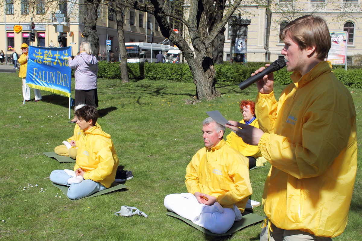 ![]() 图1-2:拉脱维亚(Latvia)法轮功学员在拉脱维亚大学和国家歌剧院之间的公园里举行讲真相活动 |