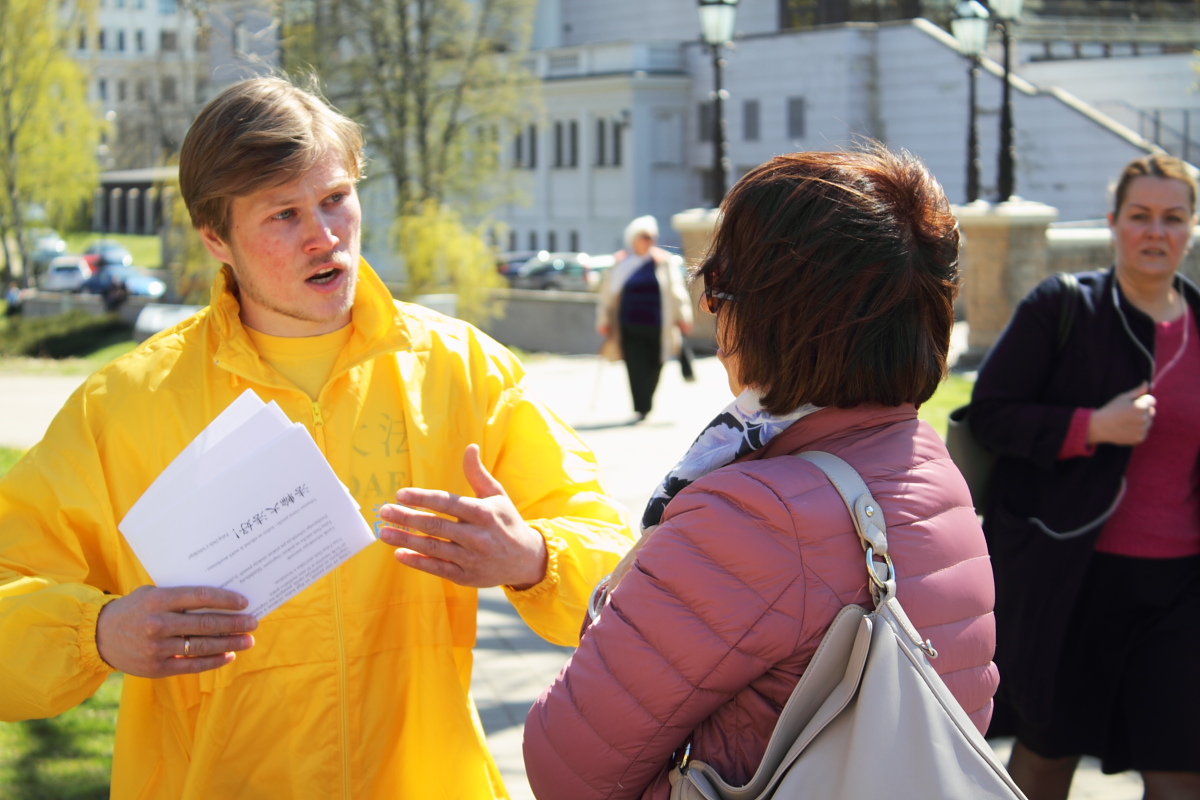 一位女士也对法轮功的活动很感兴趣,她说她的女儿在香港,是一名教师,可是从来没有听说过对法轮功的迫害。学员们告诉她,香港是自治区,法轮功学员的活动都是自由公开的,然而在中国大陆,法轮功学员每天都受到迫害的威胁,甚至被活摘器官。这名女士表示很难过和遗憾,并感谢学员让她了解了这么多的真相。