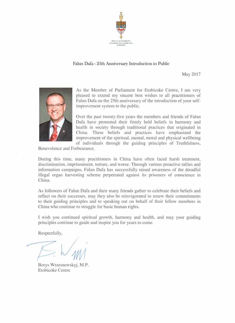 作为Etobicoke Centre 的国会议会成员,Wrzesnewskyj议员在贺信中“向所有法轮大法修炼者献上真挚的祝福,祝福法轮大法这一自我提升的修炼洪传于世二十五周年。”
