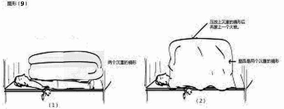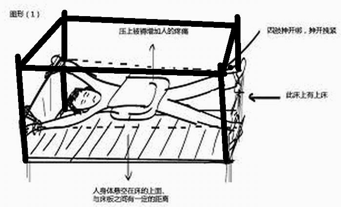 在汪秀芳第一天开始采用此酷刑时,我难受的不行,就抽出来手一点一点的推掉沉重的被和其它的褥子。汪和其她三、四个人一齐上来,掀开床板,将我的双手绑在床板左右两边的铁栏上,然后又重新在我的身上(必须是平躺的身子),压上二百多斤重的褥子和被,如图9.有时包夹人张帆还要往被褥里放上装满水的大瓶子,增加重量。那日我的左脚脚脖子被压的疼痛难忍,叫声不断,脚的踝骨好象压碎了的疼痛。在我的身体下边又是光光的床板,脚骨的疼痛劲、我身体胸部压的呼吸困难,身体下也被床板咯的骨头疼。而且室内闷、不透风,难受的我头上、脸上的汗水一条条的流下来,此时的汪又强迫我说诬陷法轮功的话,不说就加重迫害。那日我左脚踝骨被压坏,整个脚脖子悠荡着,脚不能走,去厕所一瘸一拐的忍受着剧痛。