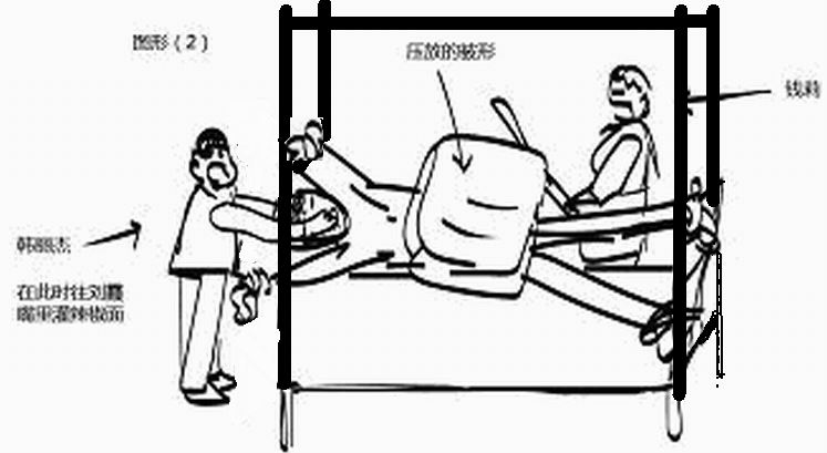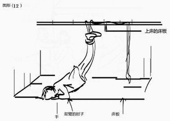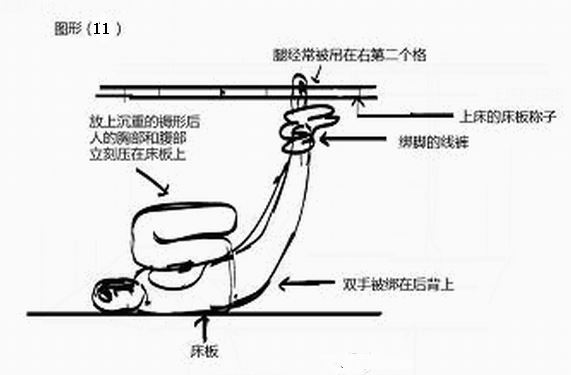 二零一一年的八月立秋之后,因气温越来越低,包夹人在前段时间(四个来月)里采用的“捂闷压”的酷刑不用了,变成了绑吊压的酷刑,如图10,这种“绑吊压” 的酷刑,首先是把人按趴在光光的床板上,一般都是三个人上来一起动手,通常是两个包夹和一个帮教,按着把我的双手,把手脖绑在身体的后背上,再用线裤的两个腿分别绑在我的两个脚脖上。绑好这头再把线裤的另一端从上床的床称上串过来,用力一拉一拽,把我的腿和腹部胸部都不同程度的提起来了。此时也只有人的脸能挨着床板时,就系好上边,接着搬来沉重的褥子压在我后腰上,此时立刻疼痛难忍,惨痛的叫声出来,又立刻被捂、闷上鼻子和嘴,反反复复的捂、闷使声音发不出去,同时强制人说诬陷大法和师父的话。此酷刑的主谋是姜凤英,还有积极配合者韩丽丽、帮教俞雪微。