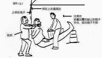 图5是把我的双臂弄到后背去,把双臂的小臂在后背上紧紧叠在一起用绳子绑上,另一端蹬着下床板,把绳子从上床的栏杆处穿过来,使劲猛的一拉、一拽, 这边人疼的疯了似的挣扎乱动,此时的汪秀芳早就骑在我双腿上放的箱子上,如图5,捂住箱子,夹住箱子,同时还在一下一下的使劲下压,让我更疼更受不了。我发出那撕心裂肺的疼痛声,钱莉的速度特快,娴熟、麻利的系紧上边的绳子,马上抓起毛巾捂住我的鼻子和嘴,禁止声音传出,汪秀芳在此时不断的一下一下的下压,同时强迫我按照她的要求说诬陷大法和大法师父的话,不说就这样折磨我,反复的多次捂、闷使我时刻处于死亡的边缘。可是她又不让我死,就是天天这样折磨我。