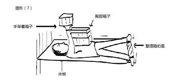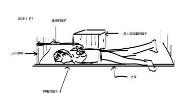 我被强制躺在床上,有时汪秀芳在我的双脚之 间放上整理箱的盖支着双脚,身上胸部被压放上沉重的一个个冰凉的箱子,同时还强迫我双手上举,举箱子,时间是天天的,长期的举,如图7双手举箱子时间一长,人的双臂也是累的、痛的到后来怎么也举不了了,两手臂软软的,无力支撑。汪秀芳此时强迫我趴着,如图8,把我按趴下后,把我的双小臂紧紧的叠放一起,绑在后背上、缠上,再把绳子的另一头从头前拉过来,用力一拽,此时疼的我乱动,一人按着、一人系好绳子,接着又往我的后背上压放沉重的一个个箱子。箱子不准弄掉了,掉了就马上增加箱子的数量,或者是换上大的。此酷刑压的人呼吸困难,双臂又特别的疼痛,都交织在一起,汗水从头上流下来,时间一长我胃里的食物常常被压出来,双脚还是要放在床的左右边上。如果被包夹发现有动的现象,就立刻遭到被踹、被狠狠的砸上一脚,这当时又是一个剧烈的疼痛和一个惊吓、一阵心跳。