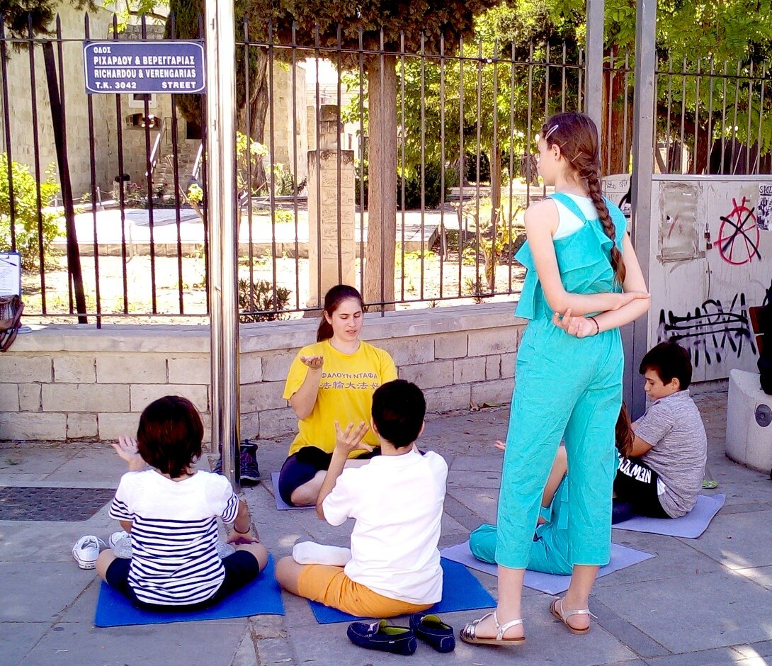 在广场上游玩的孩子们看到法轮功学员们演示功法时,几乎全被吸引来观看。一位学员前后两次为前来围观的两组孩子们演示功法。他们非常喜欢。第二组孩子在学员们炼第五套功法时,加入了打坐。其中几位非常认真投入,似乎他们真的成了炼功人。一个六年级的孩子告诉他的朋友:法轮功学员应该到学校去教!或者在我们放学后教我们炼功!学员告诉他们,那些有法轮功学员教授过学生法轮功功法的学校,都看到了学生整体表现的进步。孩子们说:这真是太好了!