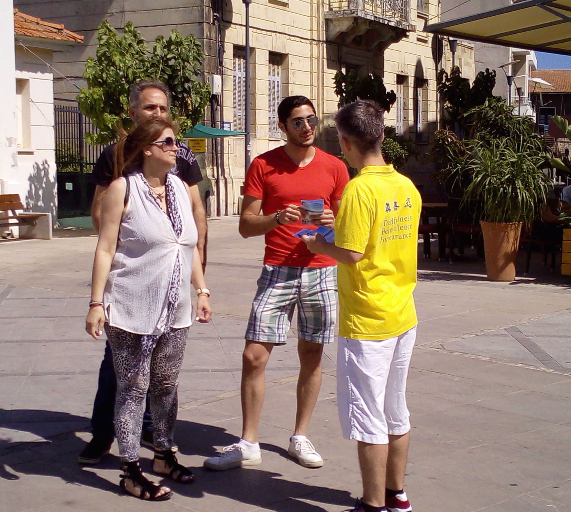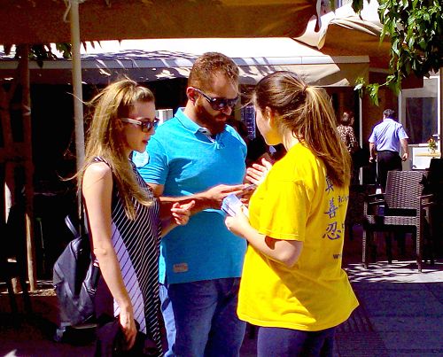 ![]() 图3-4:法轮功学员在塞浦路斯第二大城市Limasol市中心向路人讲真相 |