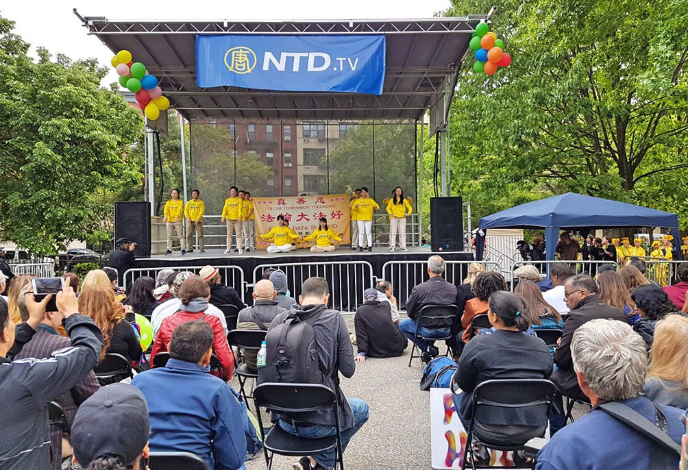 游行途径曼哈顿下城的社区,穿过曾被称为“艺术街”的阿斯特广场(Astor Place Plaza)抵达汤普金斯公园(Tompkins Square Park)。当天气候宜人,路边的餐馆坐满了纽约客,还有不少年轻人坐在自家门前的楼梯上边谈笑边观看游行,他们被法轮功学员的队伍吸引,很多人拍照。游行的组织者在汤普金斯公园内搭起舞台,让各个舞蹈团展示他们的风采。法轮功学员在舞台上的的功法演示和腰鼓表演赢得了满堂的喝彩。台下的观众跟着台上的学员学第三套功法“贯通两极法”,并随着腰鼓队的音乐手舞足蹈。