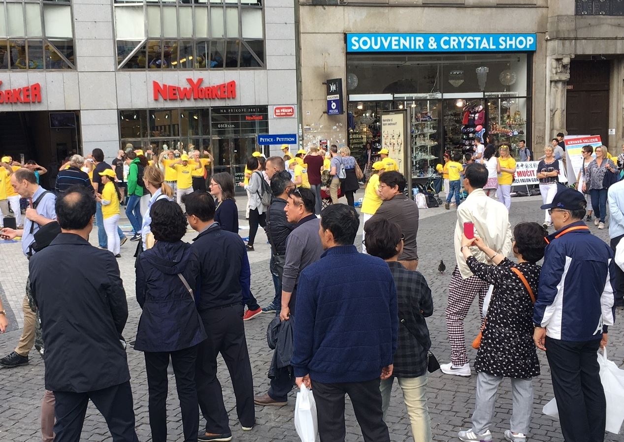 '图4:在捷克布拉格市中心,路人驻足观看法轮功学员演示功法'