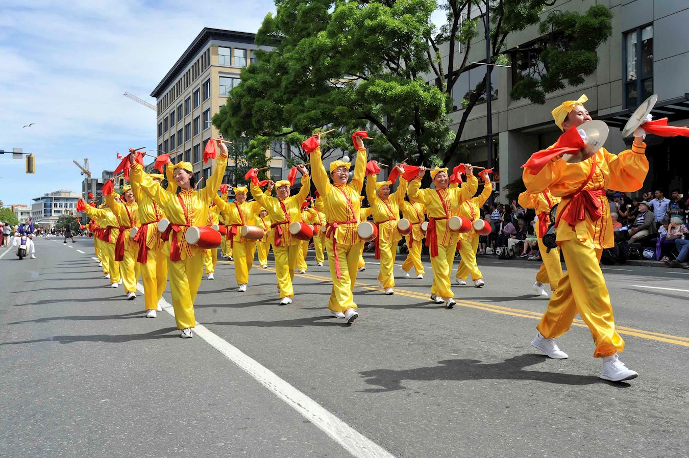 法轮大法团体的游行队伍包括天国乐团、“真善忍”花车、炼功队、腰鼓队等,长长的队伍行进在街头,受到沿途民众热烈欢迎,其中有很多来自中国大陆的移民和游客。