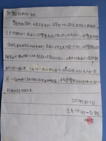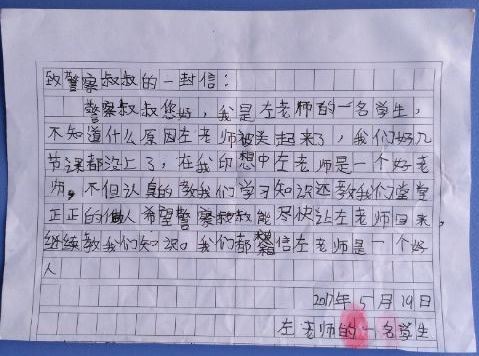 一名学生说,“不知道什么原因,我们敬爱的左老师被关起了,在我心中,警察叔叔只关坏人,不关好人,那警察叔叔你为什么要关我这么好的老师呢?在我心目中左老师是一个好人,她曾耐心的辅导我们学习,她还大大的鼓励对学习的信心,她不但教我们学习,还教我们做人的品德。左老师一直对我们说:一个人学习好品德不好,长大后一定是社会的祸害,我希望警察叔叔尽快把我们敬爱的左老师放出来!”