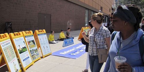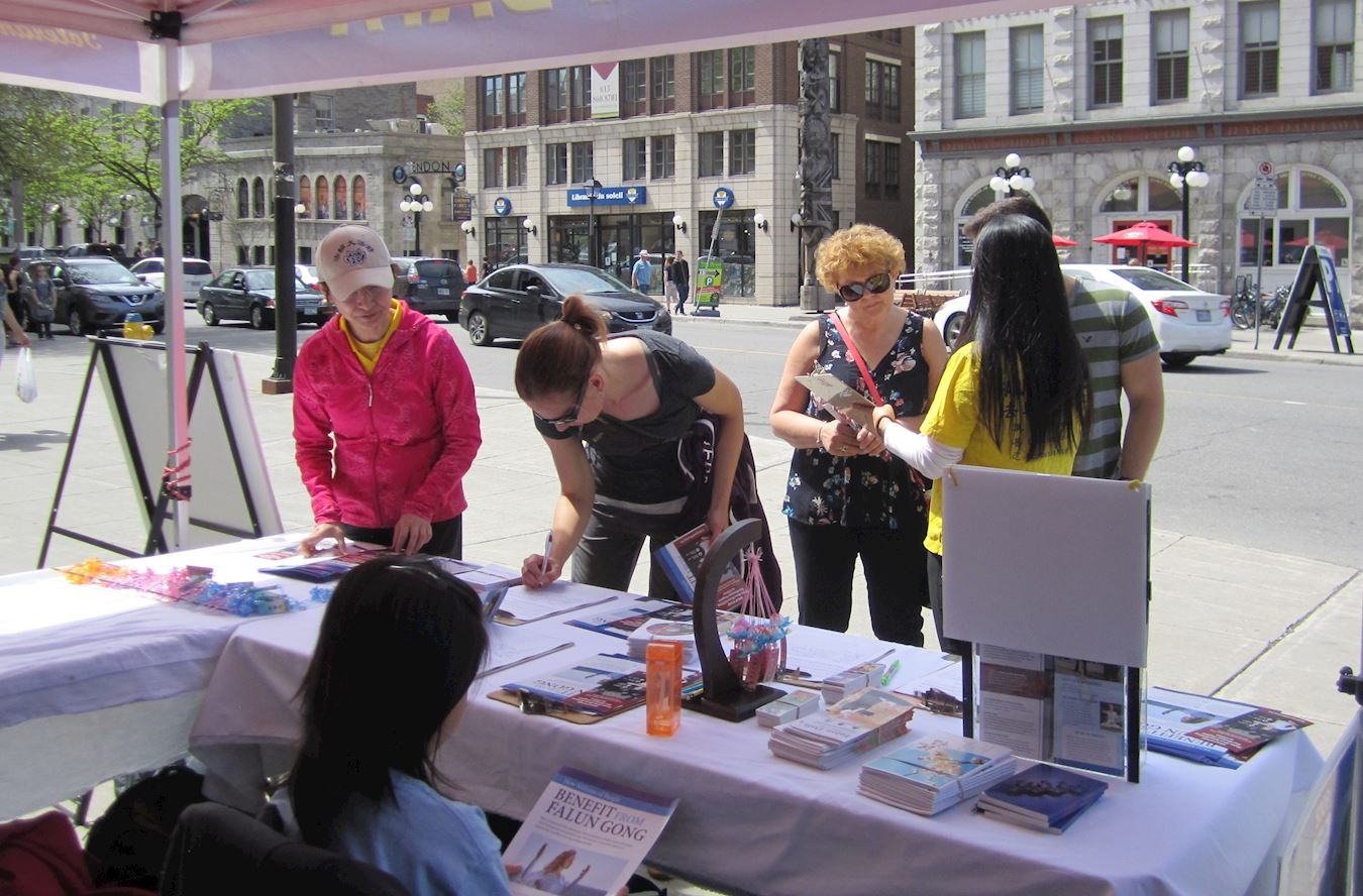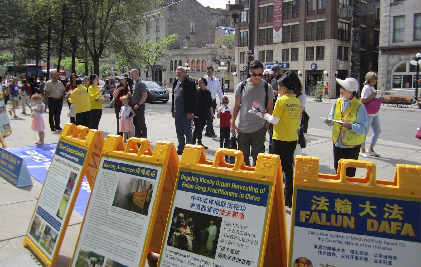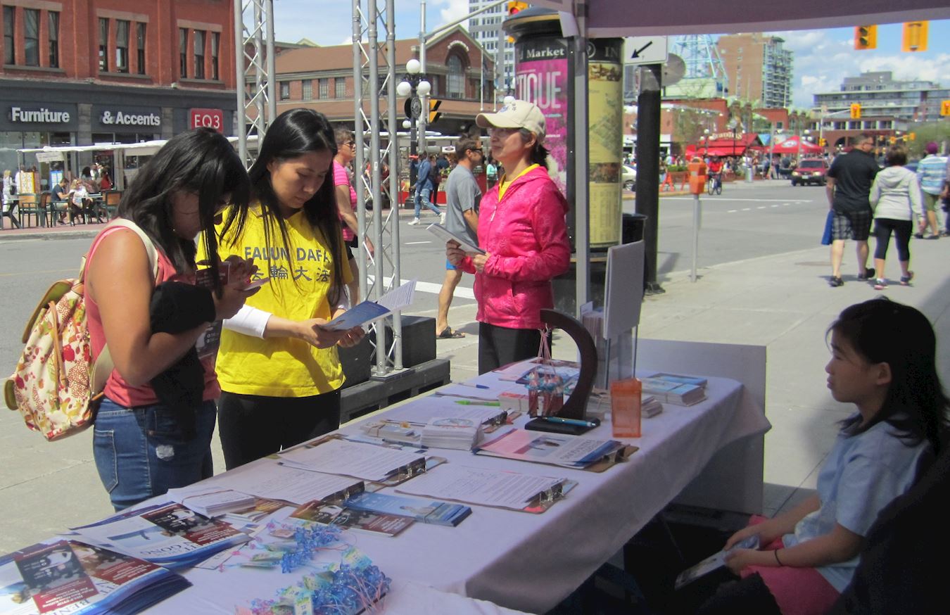 五月二十八日,在繁华的拜沃德市场西南角的George街上,法轮功学员平和的功法演示和内容丰富的真相展板让许多人停下脚步,深入了解法轮功真相。得知中国发生着针对平和的民众如此残酷的迫害,受害者中还包括加拿大公民,许多善良人非常震惊,立刻决定在营救孙茜的请愿书上签名,同时,希望制止这场对法轮功学员的群体灭绝犯罪。