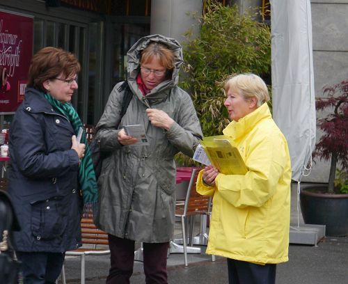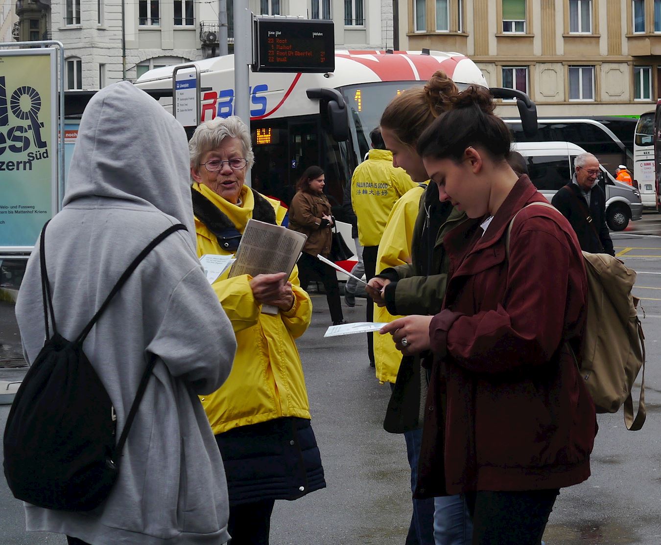 多年来法轮功学员经常在瑞士旅游胜地卢赛恩设立信息摊位,很多路人支持并感谢法轮功学员的付出。但有些路人还是第一次听说法轮功,他们打算带着真相资料在网上寻找更多的讯息。
