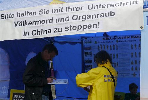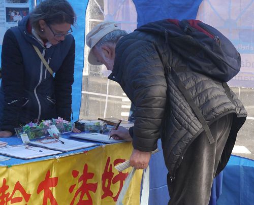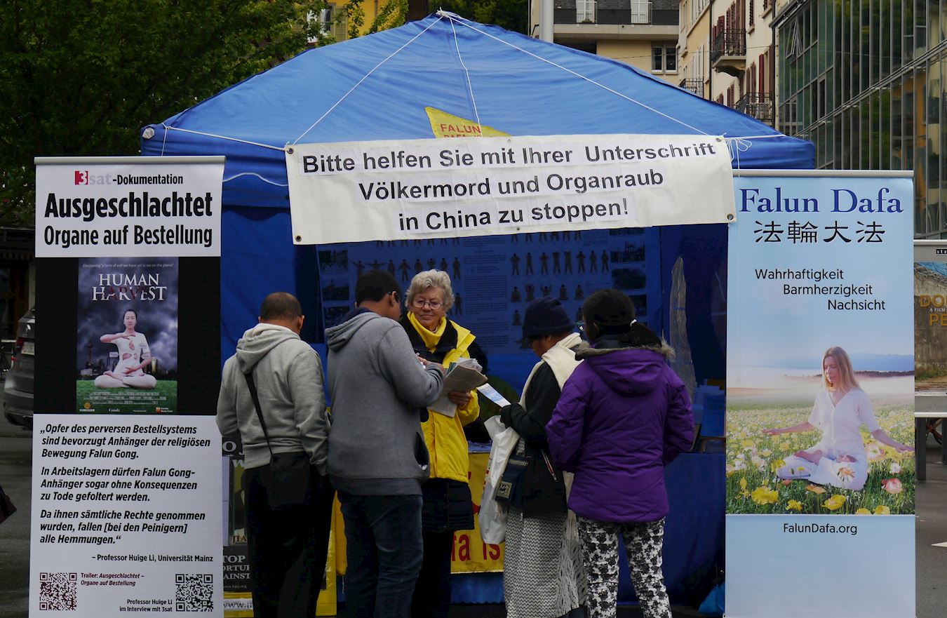 一些当地的路人和其它国家的游客在看到摊位前挂出的横幅“请签名制止在中国的群体灭绝及活摘器官”后,直接签署了三份征签表,要求瑞士政府采取行动制止中共迫害法轮功,联合国制止中共活摘法轮功学员器官的罪行以及声援起诉迫害法轮功的罪魁祸首江泽民。