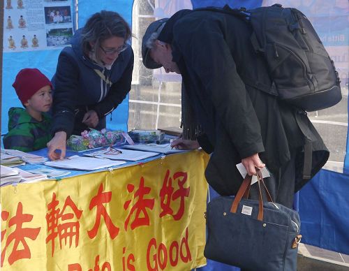 虽然当天阴雨绵绵,比起往年的五月格外的寒冷,还是有不少路人驻足观看展板。不断有中国旅游团经过,有的吃惊的看着法轮功学员设立的摊位,听着西人对他们说“法轮大法好”,但是很多中国游客似乎已经习惯在海外景点能看到法轮功真相,他们欣然接过真相报纸。有的临行前还不断的感谢法轮功学员;有的特意到摊位前索要中文的真相资料;也有的干脆将中文展板拍照留念。一位中国导游对法轮功学员竖起了大拇指,并告诉学员,自己很了解法轮功的真相,也会给带的游客直接提法轮功。