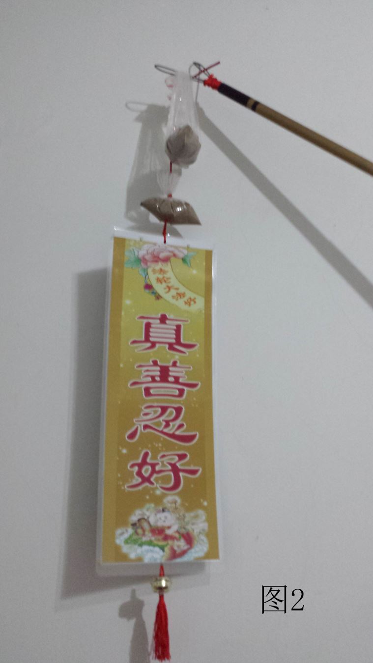 5、悬挂:取出鱼竿拉开,上好杈头,取出条幅,将杈头叉在4号沙袋的袋口内缘处,即距袋口不远处的自封袋上(如图2),看准目标,向其高举一送即已挂好。在实践中,如果将杈头叉在系袋口的悬绳处,待鱼竿举起,只要有风悬绳就会绕在杈头上,因是晚间挂的又比较高,目标看的不是很清楚,一次挂成功的比较少,而叉在袋口内缘基本上都是一次成功。