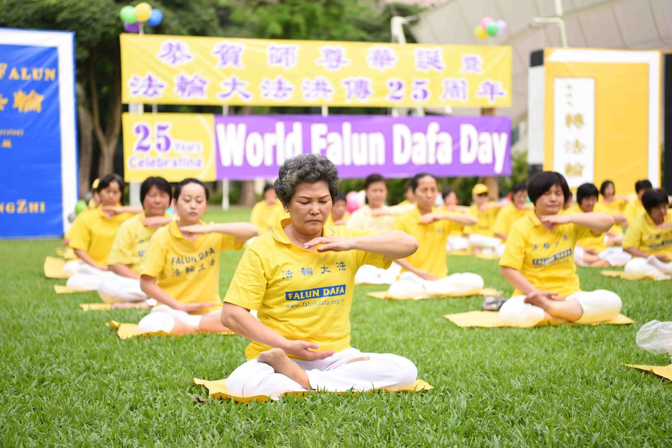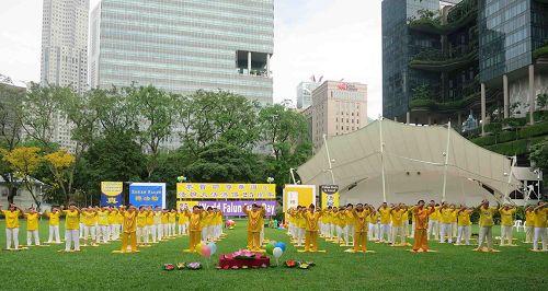 ![]() 图2~3:二零一七年五月二日,新加坡法轮功学员在芳林公园庆祝即将来临的世界法轮大法日。图为学员们正在集体炼功。 |