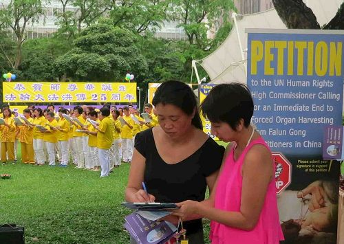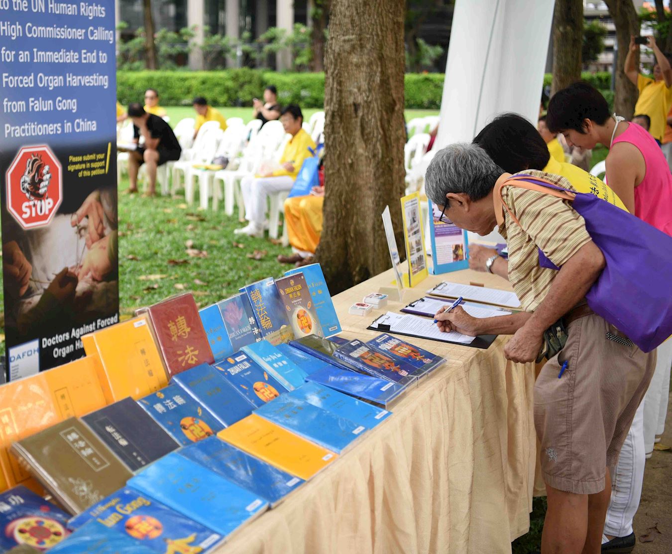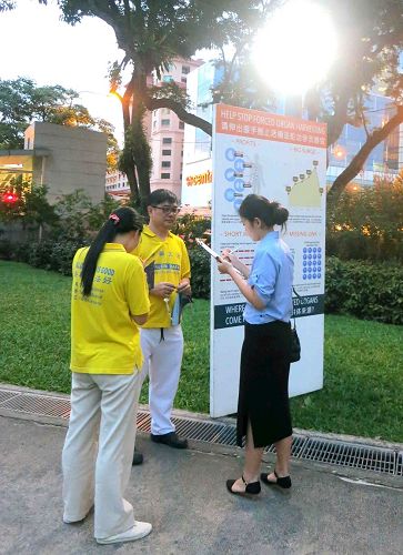 年轻的Jamie小姐是新加坡人。她在征签表上签名后说,以前就知道一些法轮功遭受迫害的事实,不过,很高兴碰到法轮功学员,可以更加深入地了解。她说:“我自己做过对中国的研究,包括(中共)怎么迫害西藏的僧人等。”就好像西藏的僧人为了抗议中共暴政而自焚,她原以为二零零一年发生在天安门的自焚事件,是法轮功学员做出的类似抗争。当得知,天安门自焚是中共为栽赃陷害法轮功而一手导演的伪案时,她感到非常震惊,她说回去一定去看《伪火》(False Fire)这部纪录片。