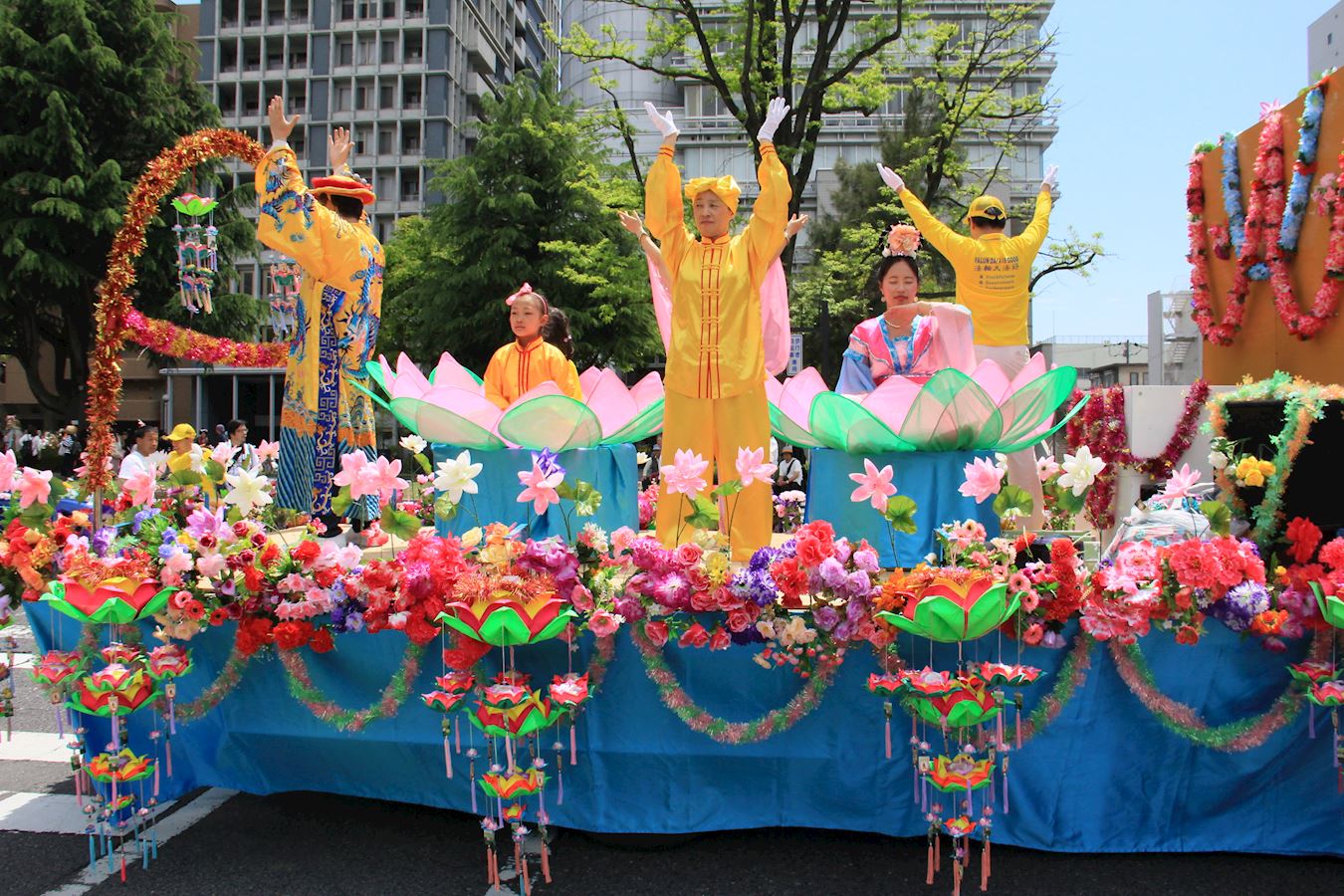 图1~3:参加第四十一届广岛鲜花节的法轮功队伍和花车,气势磅礴,绚丽多彩 |