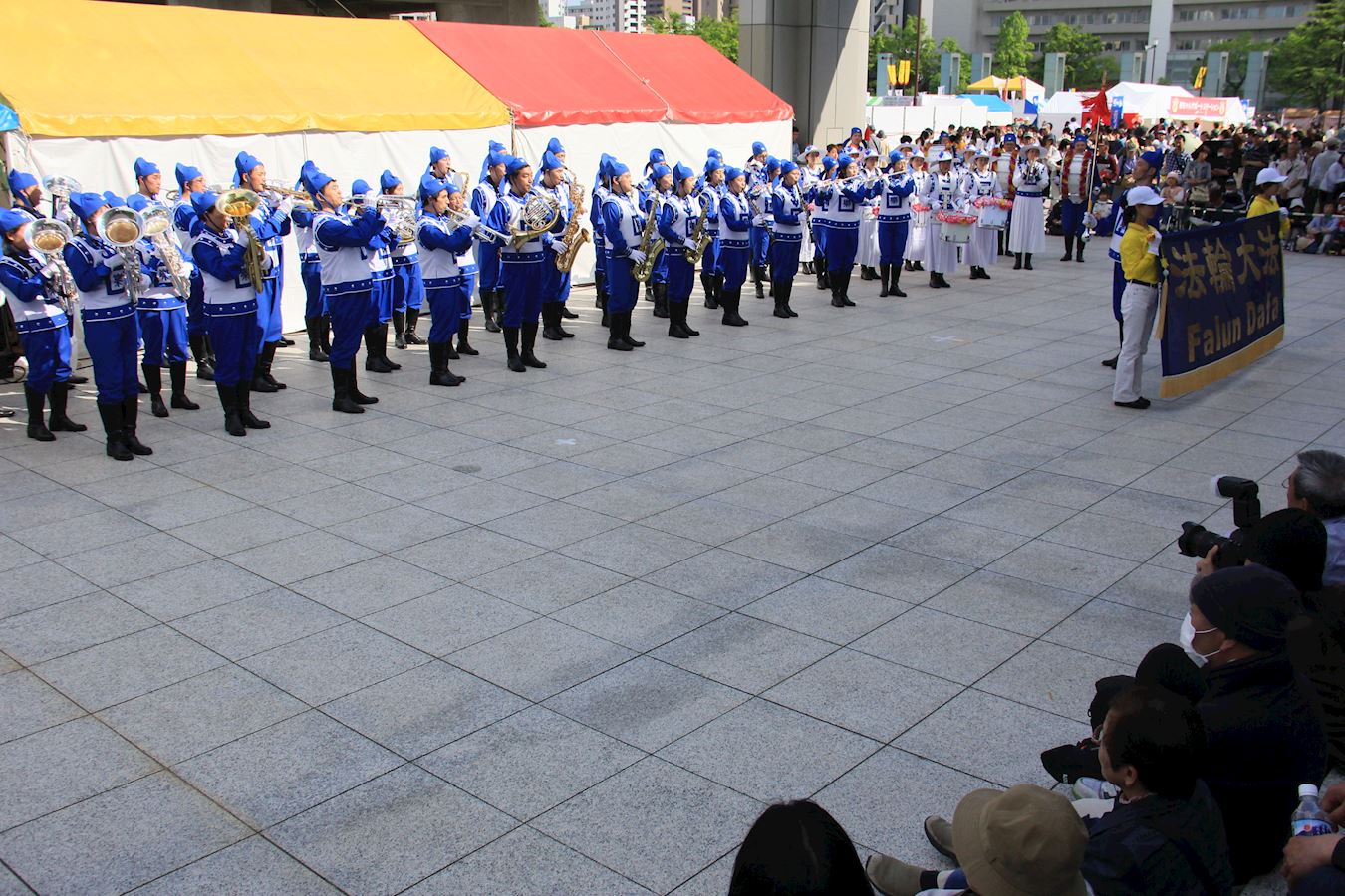在队列表演过程中,密集的观众为法轮功团体喝彩,学员与观众互动,并赠送纸折莲花。主办总部女播音员介绍完法轮功后说:“她们在赠送吉祥物,谁要得到了那很幸运喽!”